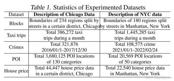 在嵌入空间中保持 POI 语义信息方面,采用 Skip-gram 与多层感知机(MLP)相结合的方法,对 POI 矩阵P 进行表示学习,并映射至潜在语义空间。具体而言,首先利用 Skip-gram 模型捕获每个 POI 的上下文语义信息,随后通过 MLP 对上下文嵌入进行非线性变换,得到最终的 POI 表示向量。该过程能够有效刻画 POI 之间的语义相关性,并在嵌入空间中予以保留。最终得到的表示矩阵