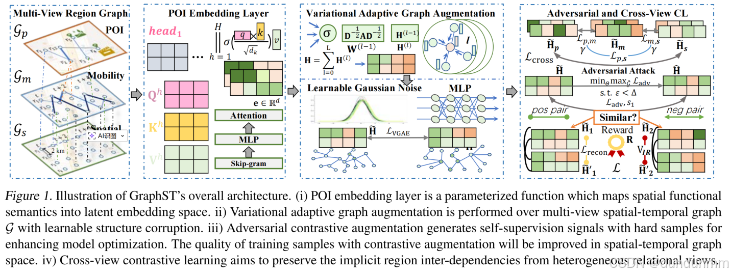 为解决上述问题,提出了一种新的模型------GraphST ,通过蒸馏自监督信息来推进时空图表示学习。具体而言,为在多视角区域图上自适应地生成自监督信号,设计了一种可学习函数,用以刻画城市中不同区域之间的全局城市语境信息。同时,提出了一种对抗式对比学习模型,在对比学习的极小极大优化框架下,使 GraphST 具备自动识别困难正样本与负样本的能力。最后,引入跨视角对比学习方法,以捕获不同关系视角之间的依赖关系,并通过自判别机制增强不同区域表示的一致性与均匀性。