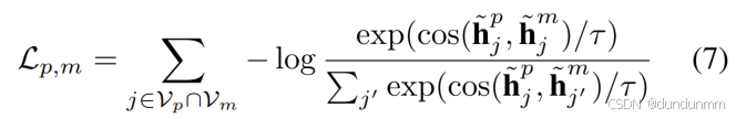 以 POI 图视角 (Gp,H~p) 与出行图视角 (Gm,H~m) 之间的对比为例,其对比损失定义为: