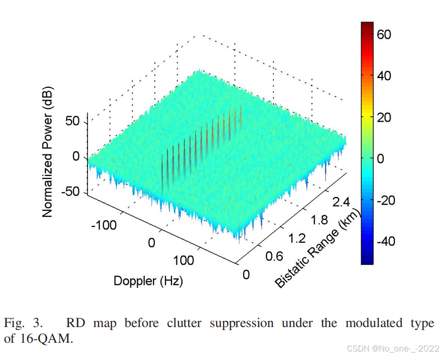 为了突显杂波抑制的重要性,图 3 给出了在 16-QAM 调制类型下杂波抑制前的距离-多普勒 (RD) 图。该图是基于 2-D DFT 方法并在 OFDM 符号上进行脉冲压缩获得的。从图 3 中我们可以看到,在没有任何对消或缓解效果之前,模拟杂波存在于零频率处,且目标被杂波旁瓣掩盖,这表明了在基于 CP-OFDM 的无源雷达中进行杂波抑制的必要性。