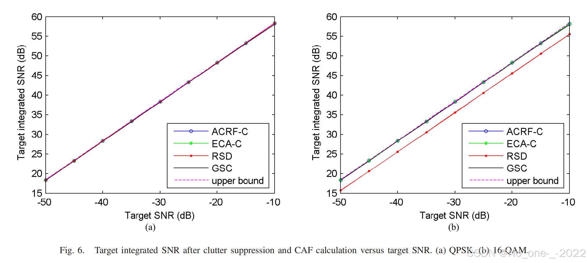 相比之下,图 6(b) 表明,在 16-QAM 调制类型下,RSD 算法将目标 SNR 相比 ACRF-C 和 ECA-C 方法降低了约 2.83 dB 2.83\text{ dB} 2.83 dB,这与理论分析一致。同样,ACRF-C 和 ECA-C 方法在非等模调制方案中也能达到上限。需要注意的是,时域方法在图 6(a) 和图 6(b) 中几乎都获得了目标积分 SNR 的上限,因为它与发射波形无关。通常,就杂波抑制性能而言,