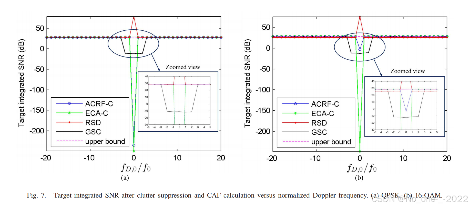 对于 QPSK,三种子载波域算法表现出相同的目标检测性能,并且与时域方法 GSC 相当。即使对于非等模调制方案,尽管 ECA-C 在零多普勒处产生更深的零陷,ACRF-C 获得的目标检测性能也几乎与 ECA-C 相同。