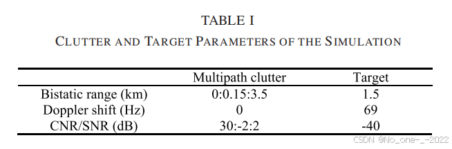 仿真参数的值列于表 I 中。在监测通道中,使用 15 个静止散射体来模拟杂波。杂波的杂噪比 (CNR) 取值为 ( 30 : − 2 : 2 ) dB (30:-2:2)\text{ dB} (30:−2:2) dB,其中 ( 30 : − 2 : 2 ) (30:-2:2) (30:−2:2) 表示从 30 到 2、步长为 -2 的序列。对应的双基地距离为 ( 0 : 0.15 : 3.5 ) km (0:0.15:3.5)\text{ km} (0:0.15:3.5) km。此外,在双基地距离 1.5 km 1.5\text{ km} 1.5 km 和多普勒频移 69 Hz 69\text{ Hz} 69 Hz 附近合成了一个信噪比 (SNR) 为 − 40 dB -40\text{ dB} −40 dB 的目标。此外,热噪声被建模为复高斯白噪声。