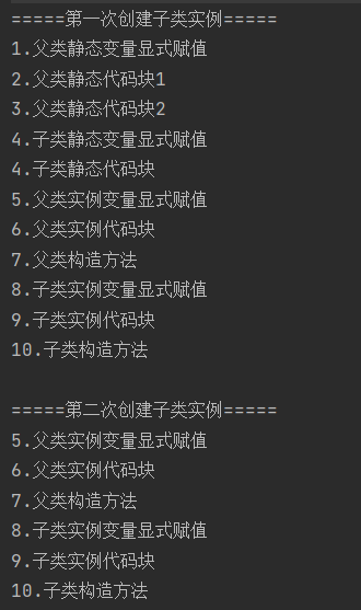 System.out.println("=====第一次创建子类实例=====");