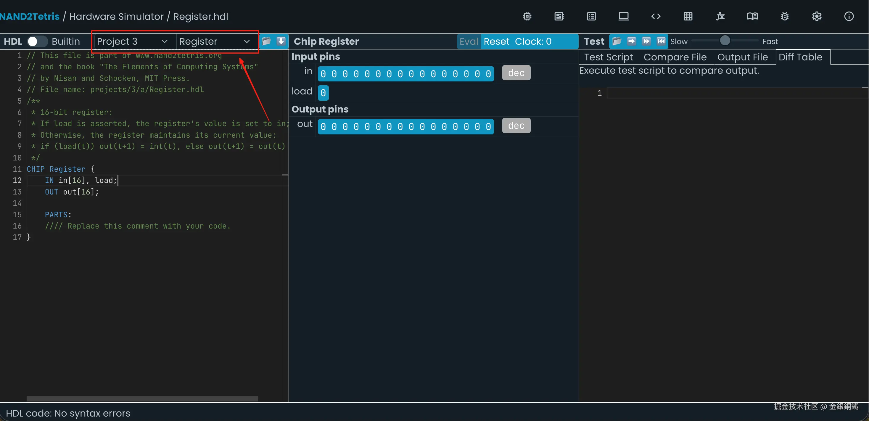 前往 Nand to Tetris Online IDE,选择 Project 3 里的 Register,效果如下图所示 ⬇️