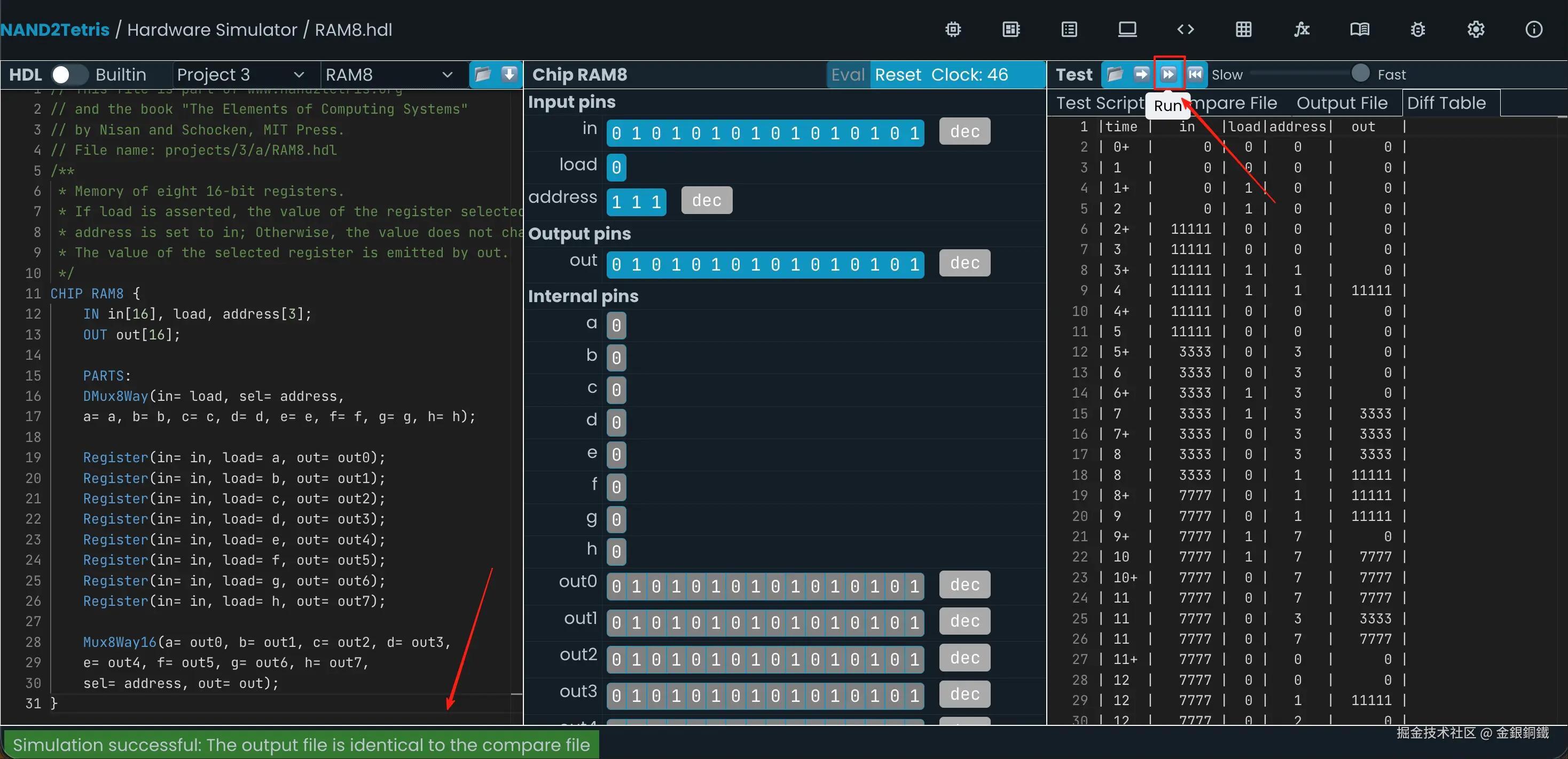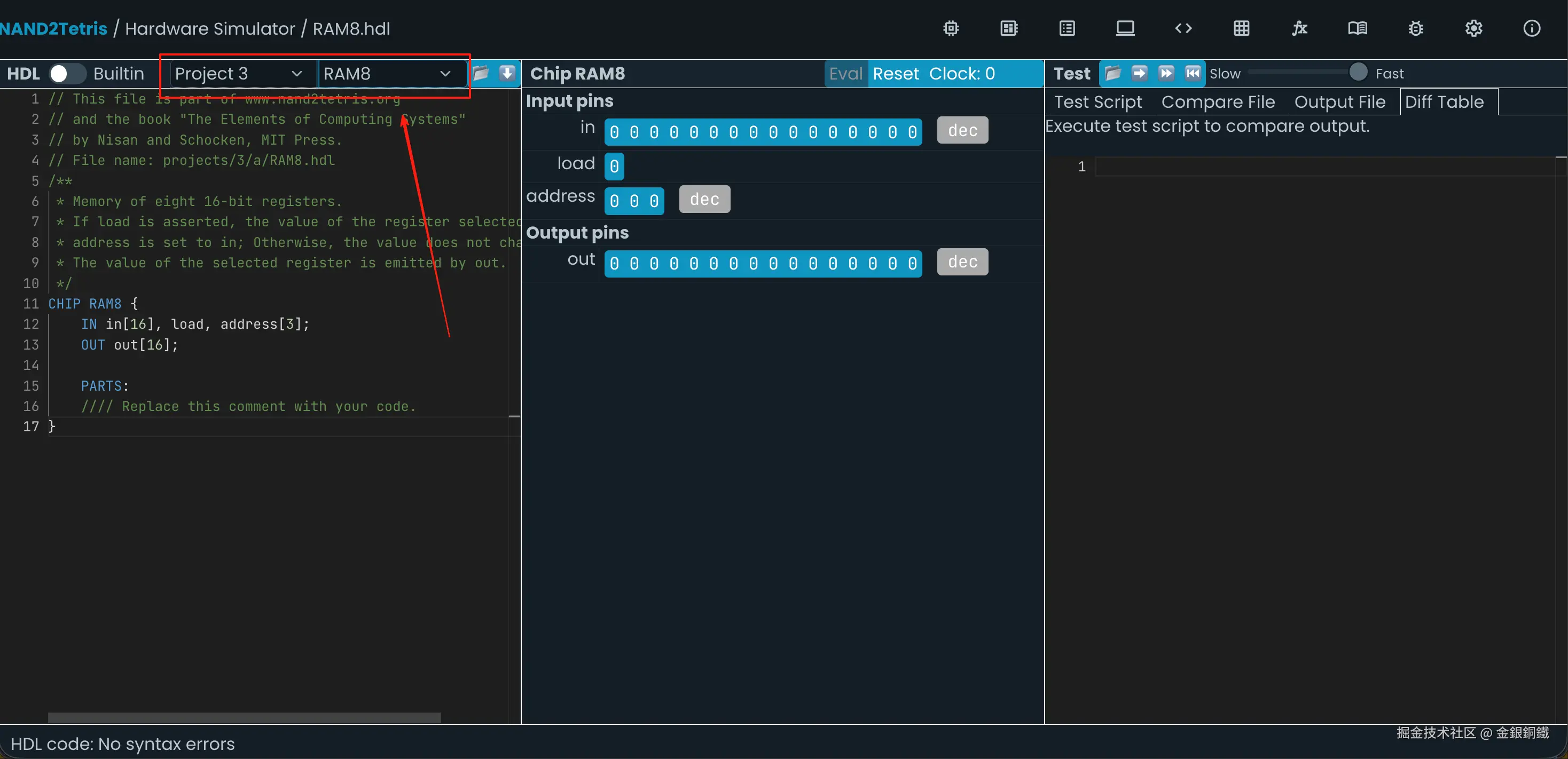 前往 Nand to Tetris Online IDE,选择 Project 3 里的 RAM8,效果如下图所示 ⬇️