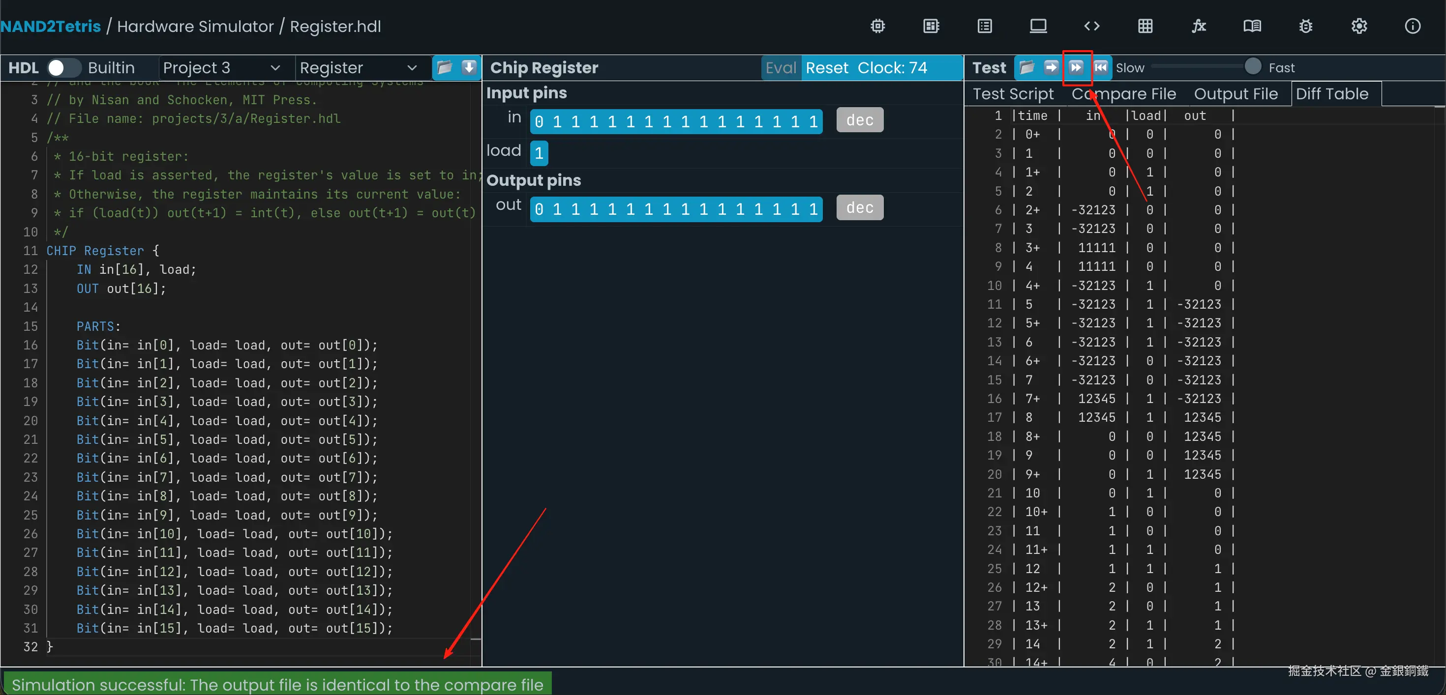 我们在上一步里已经实现了 Bit(一位寄存器),既然 Register 是 <math xmlns="http://www.w3.org/1998/Math/MathML"> 16 16 </math>16 位寄存器,那么可以把 Register 当作 <math xmlns="http://www.w3.org/1998/Math/MathML"> 16 16 </math>16 个一位寄存器的组合。