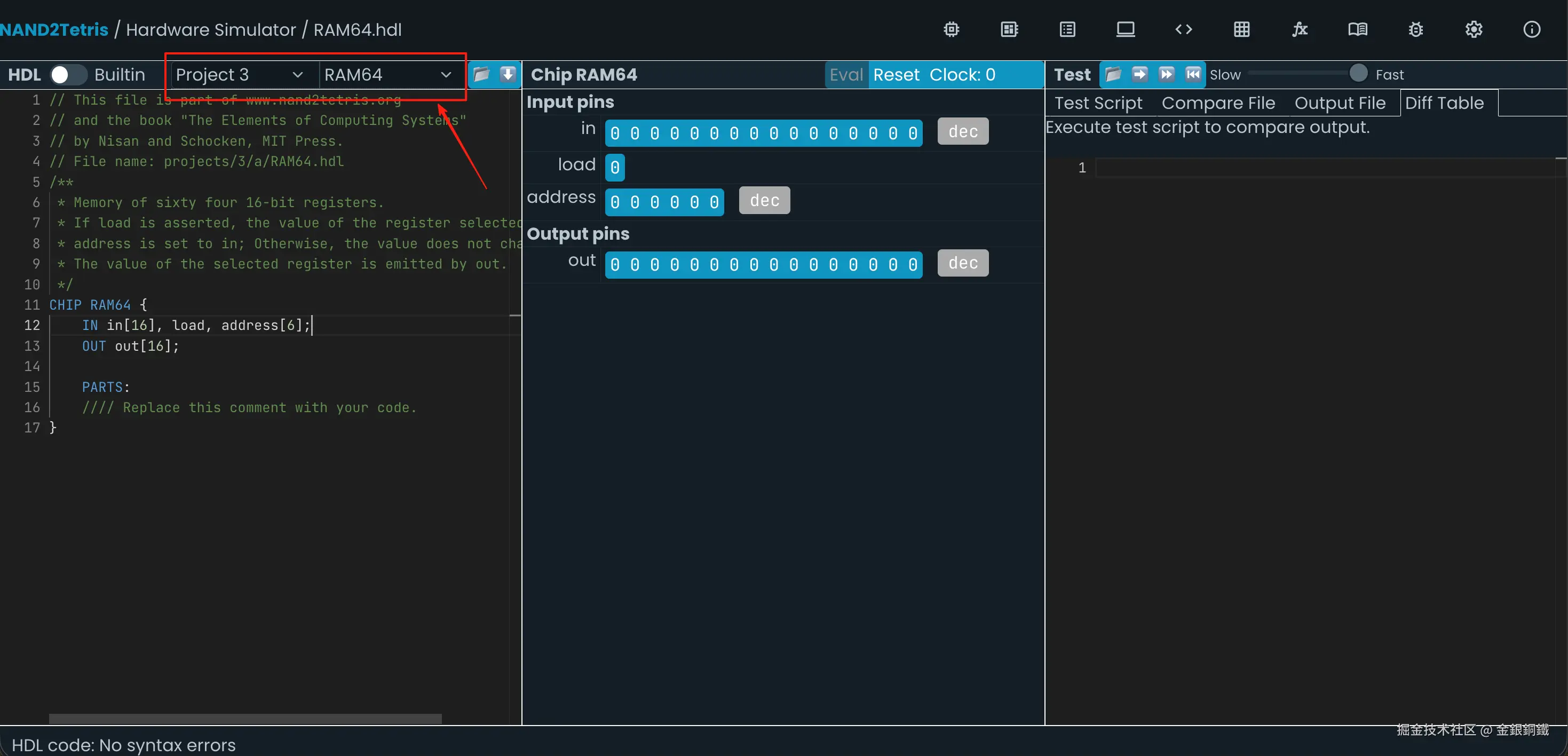 前往 Nand to Tetris Online IDE,选择 Project 3 里的 RAM64,效果如下图所示 ⬇️