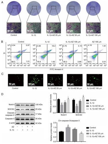 AZ inhibits IL-1β-induced chondrocyte apoptosis by promoting Notch1 expression. Chondrocytes were pretreated with or without IL-1β (20 ng/ml) for 24 h and were then treated with AZ (25, 50 or 100 µM) for an additional 24 h[7].