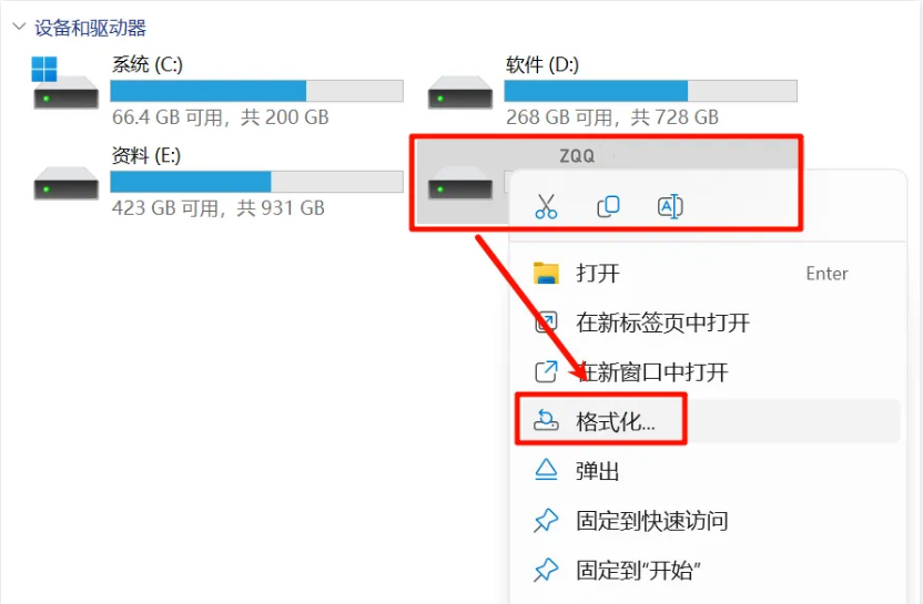 02右键格式化该U盘(有重要数据请提前备份,因为数据会被全部清空)