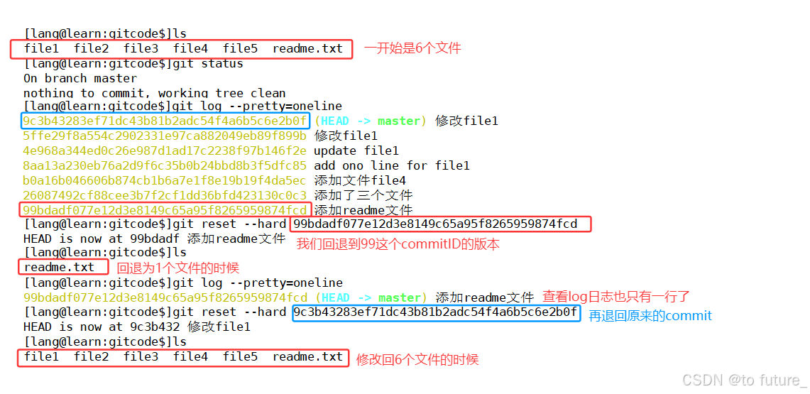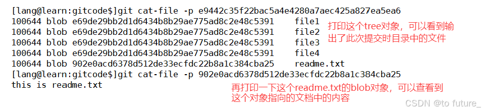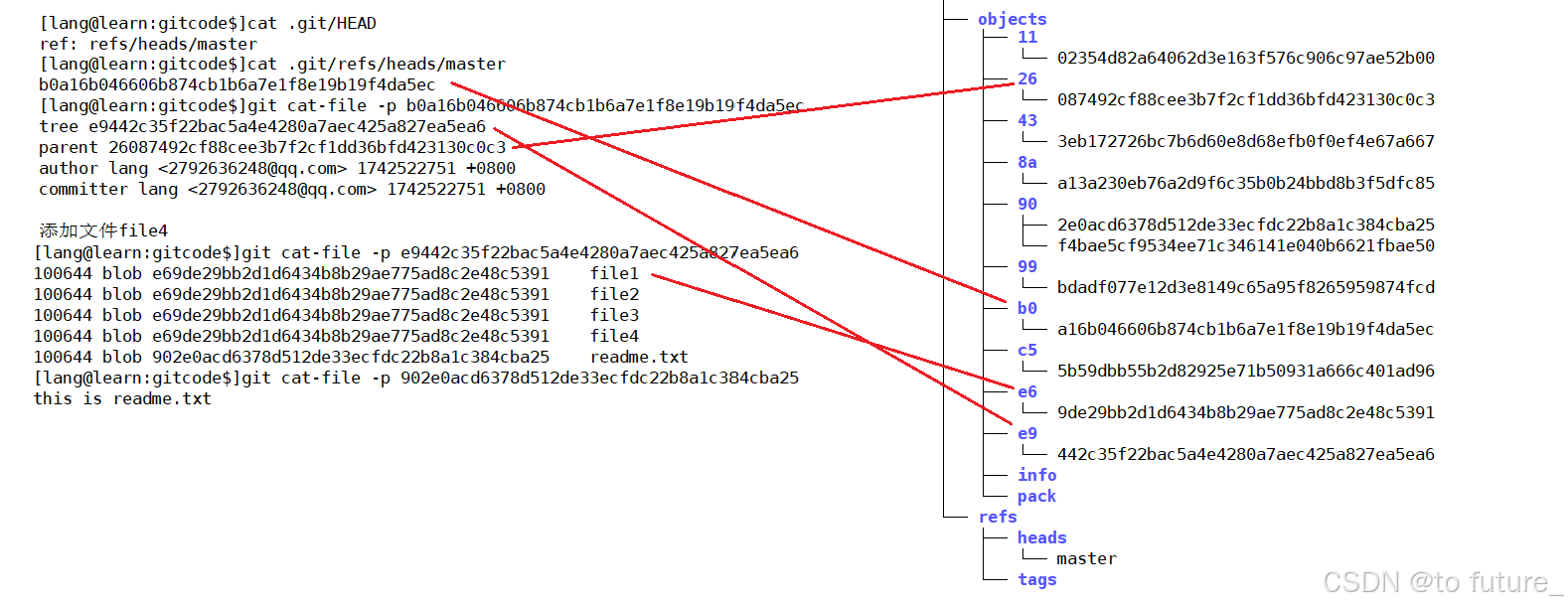 所以说,我们的HEAD指向的是最新的一次提交commitID,通过这个commitID我们可以找到提交时的目录结构,还可以通过打印目录结构,找到这次提交中的内容: