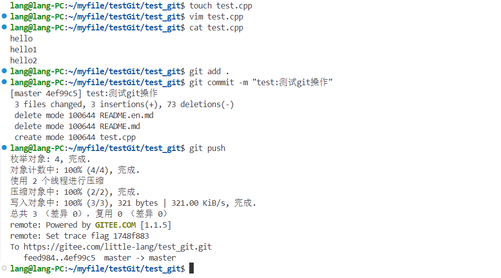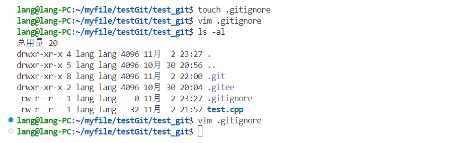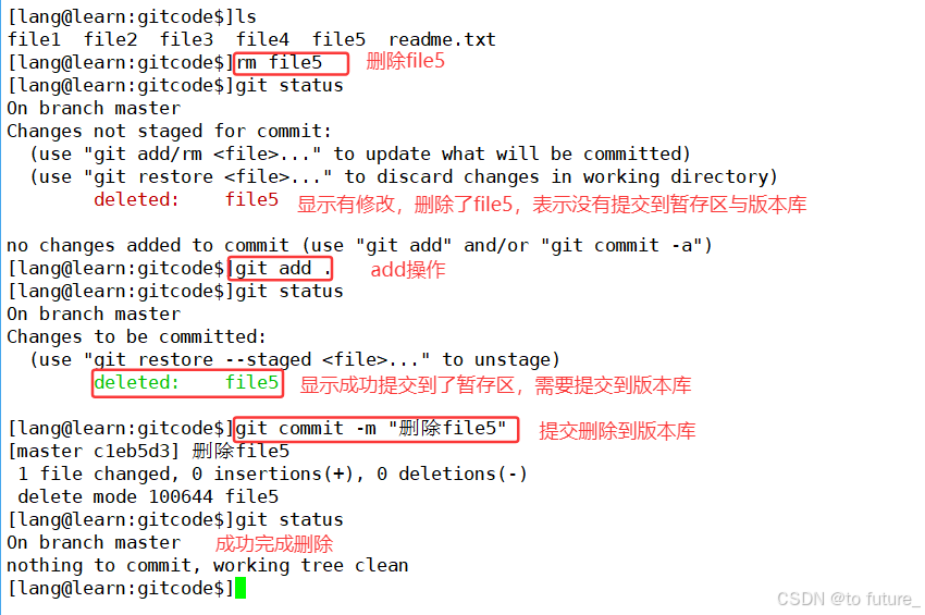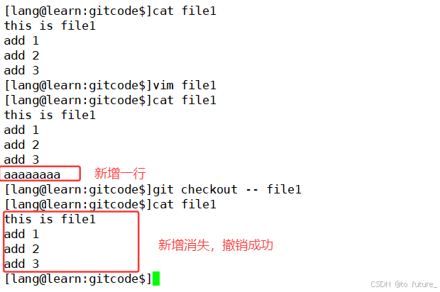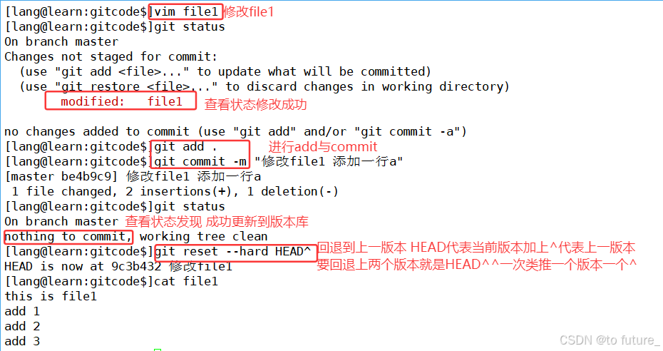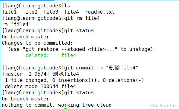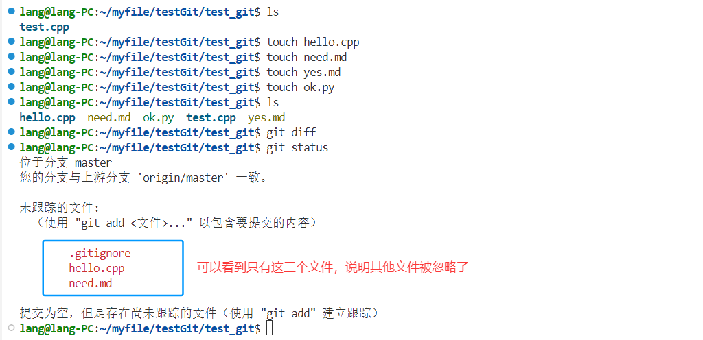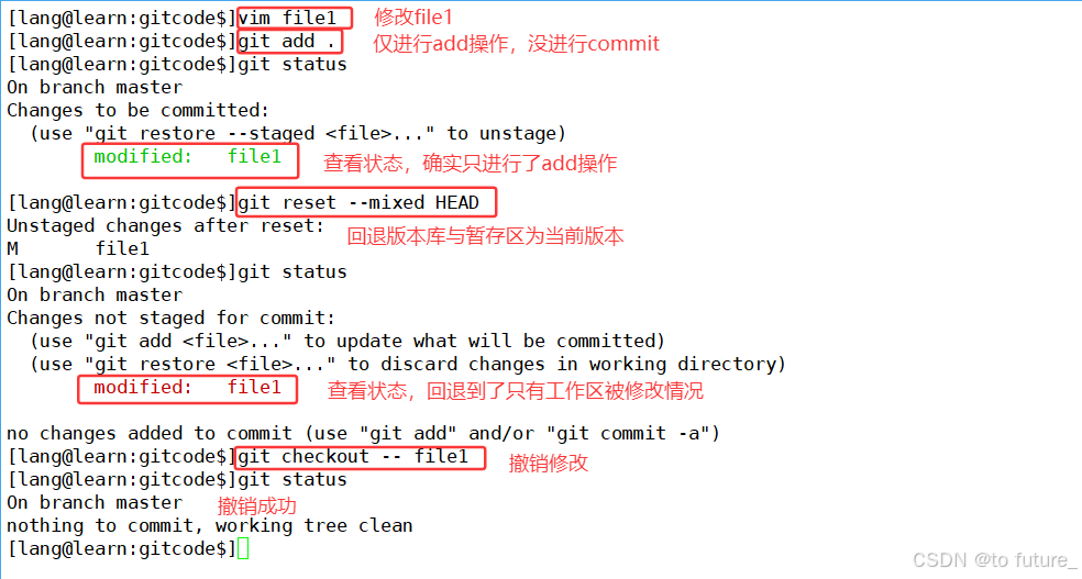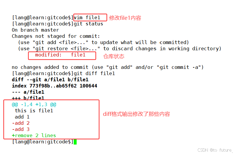 对于修改工作区,无论是进行新增或者是删除又或者是修改文档内容,这些都算是修改工作区;在我们修改了工作区后,我们可以通过这些命名来查看仓库的状态以及修改了哪些些内容: