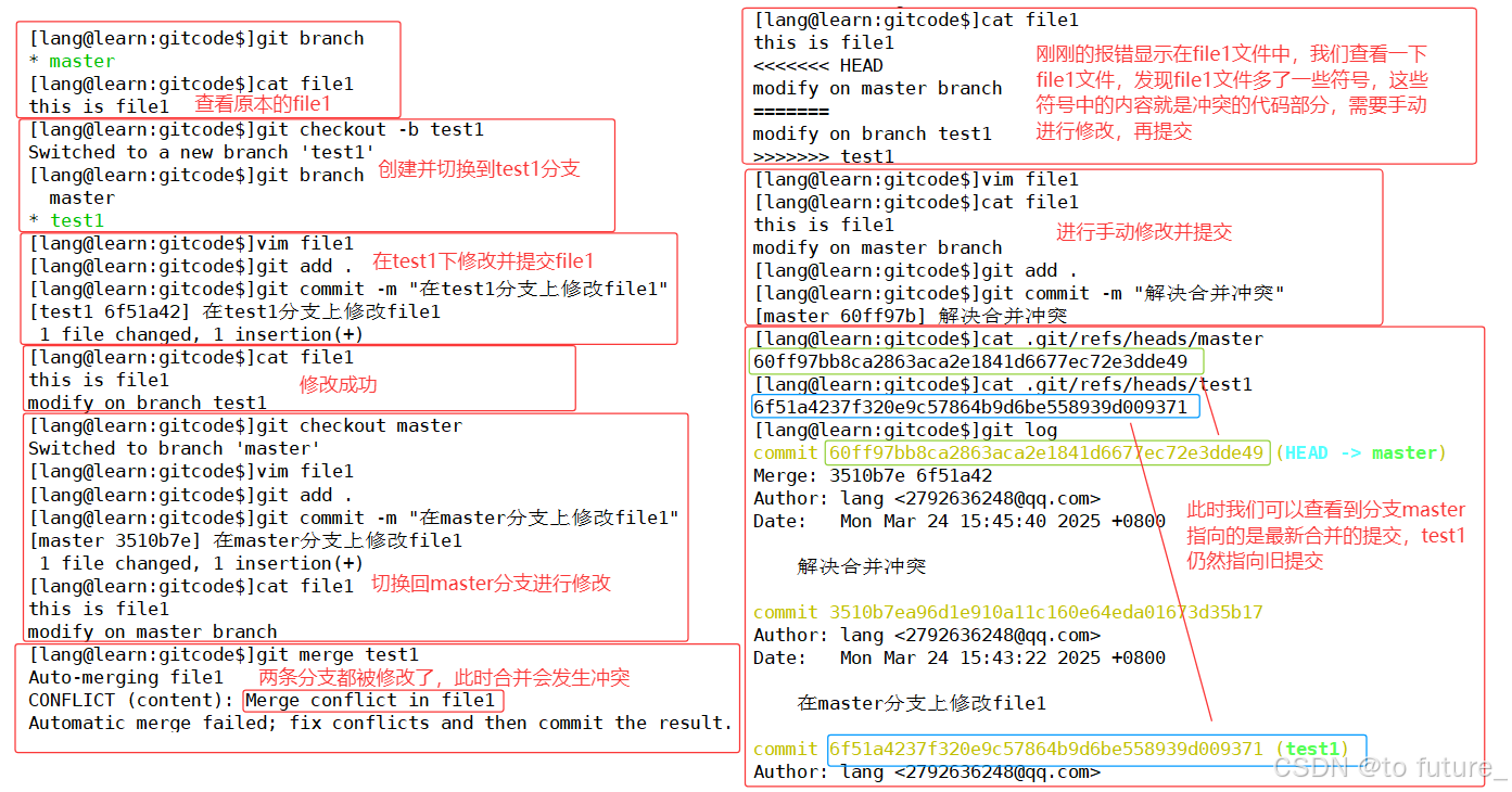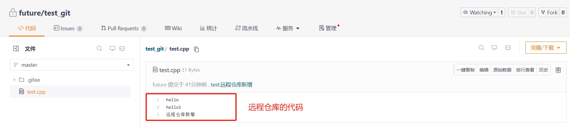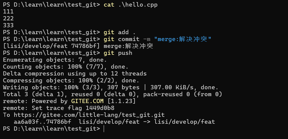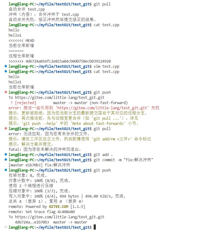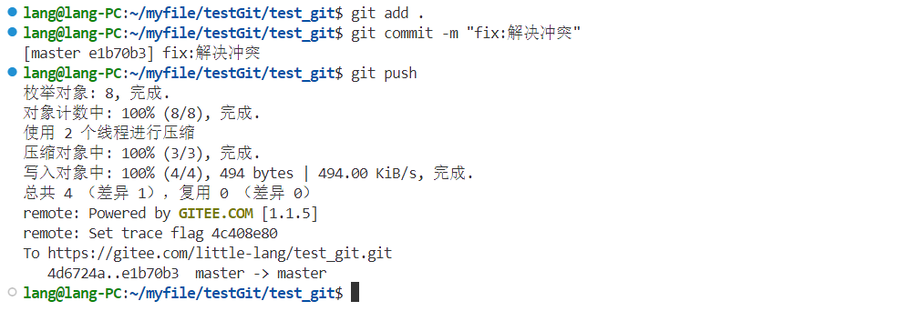 此时你就可以在你想要合并的分支看到你的代码了;但是往往合并的过程不是这么顺利的,说不定这个时候你的leader就会说,小张啊,你这个合并有冲突,你先去解决一下,这个时候我们就得手动解决冲突了,怎么解决呢?