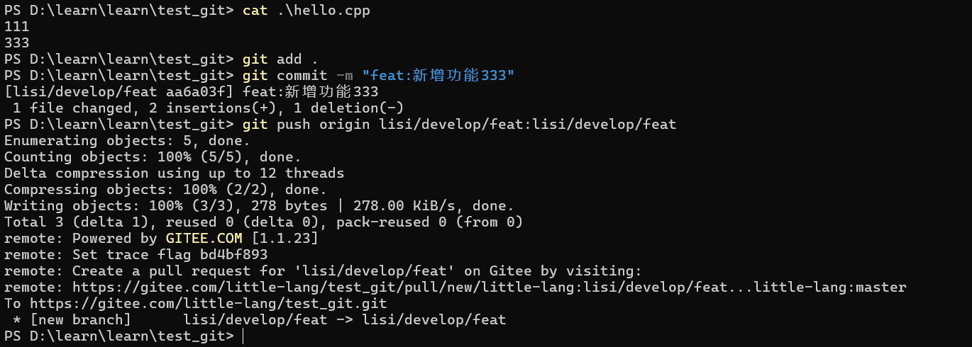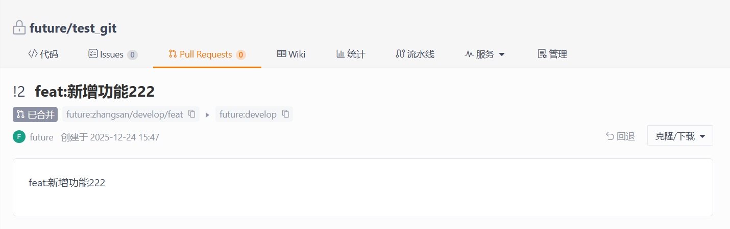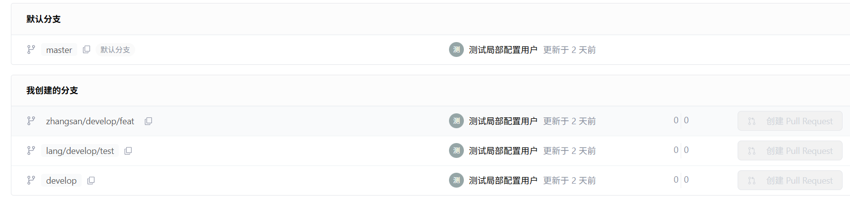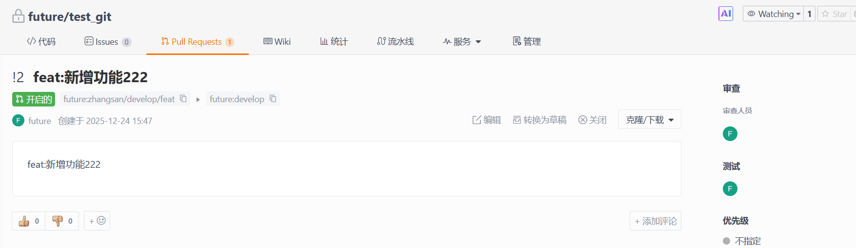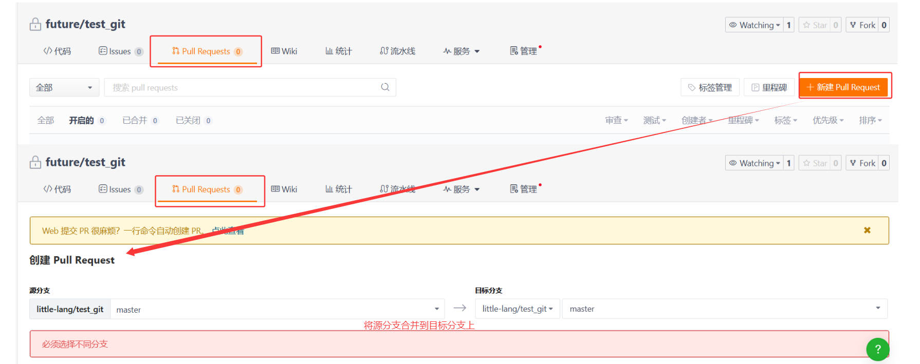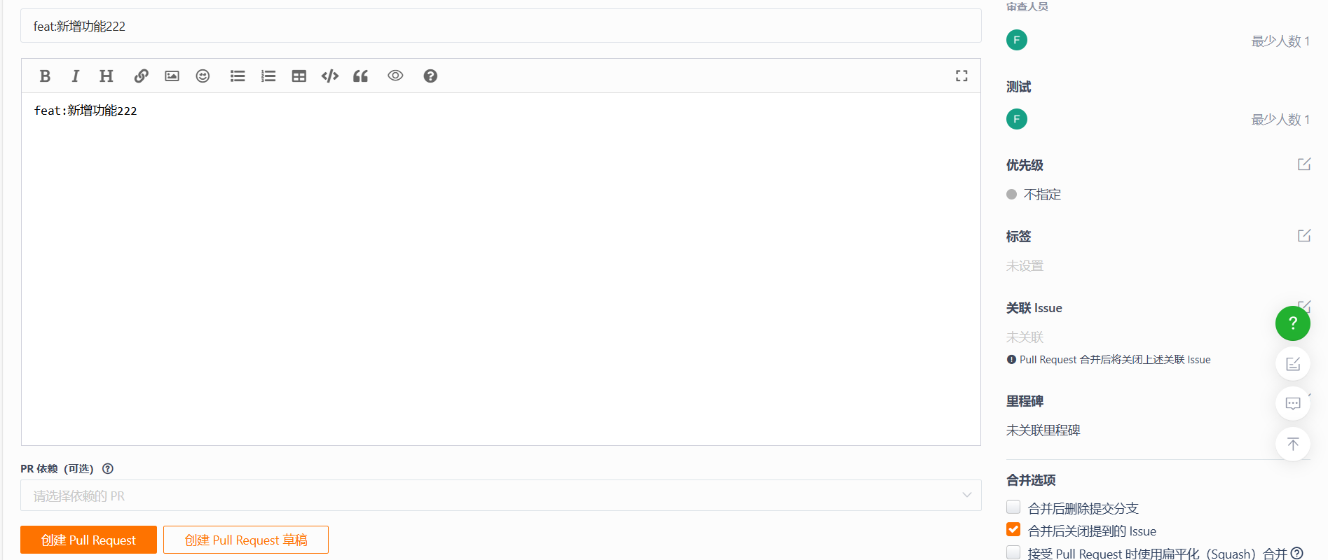 我们上面创建新分支,并修改了新分支的代码后,我们想要合并代码到主分支或者develop分支,此时我们如何合并呢,如果是我们个人我们可以先在本地把代码直接合并到develop分支或主分支,但如果是多人协作,你的代码需要被审核之后才能被合并到目标分支,所以此时,你需要进行PR操作,发起合并请求;