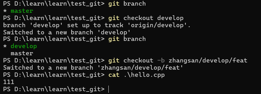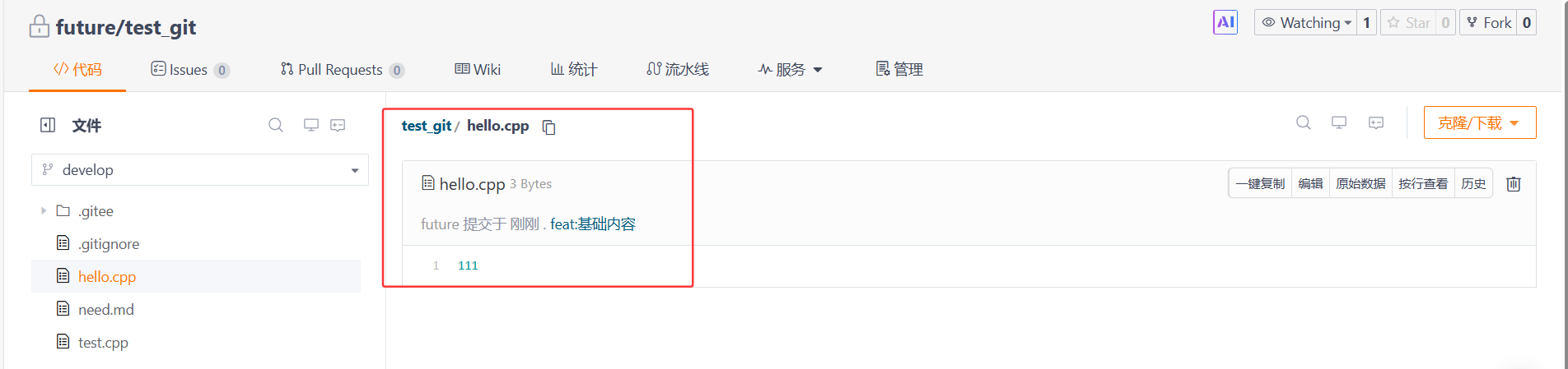 假设我们一开始的develop分支的内容是111,这是develop分支的稳定内容,这里的功能是稳定的前人开发好的: