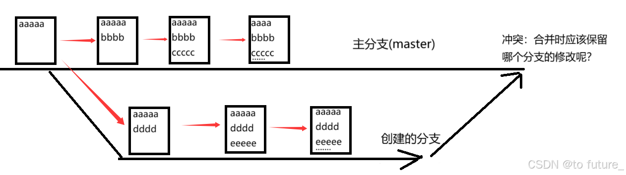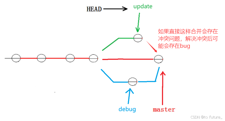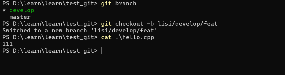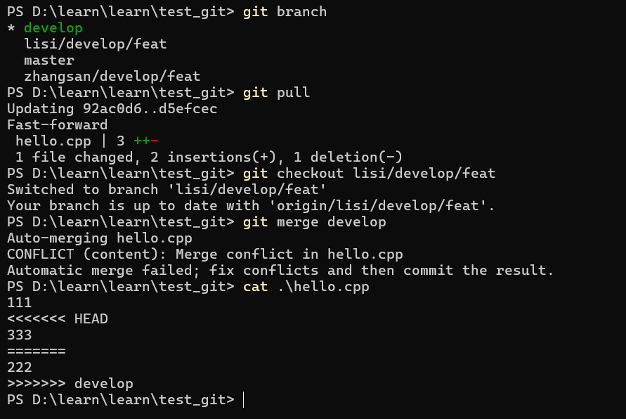 我们先模拟一下冲突的场景,我们刚刚develop分支修改了,而此时如果基于原develop分支的另一个分支也新增功能,然后进行merge,这个时候就会出现冲突;