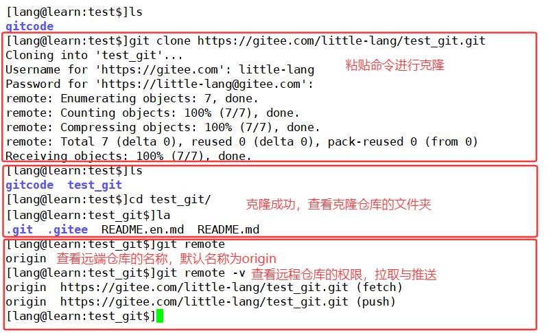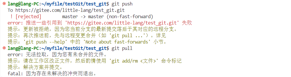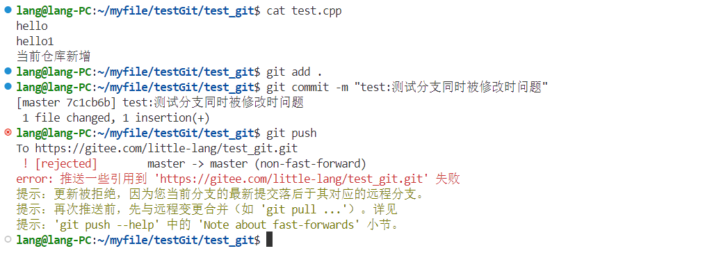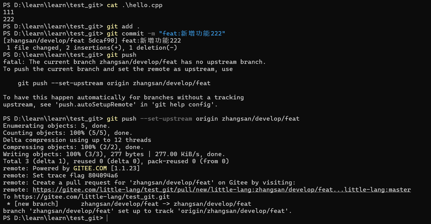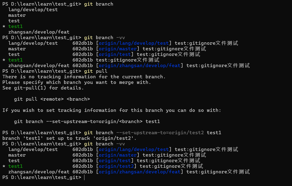 我们可以看到,当我们本地分支没有和远程分支建立连接时,我们使用与远程分支交互的命令,如git pull,git push这样的命令,都会有提示,我们只需要按照给的提示的命令输入,就可以完成连接远程分支操作,就像我们上面的图片中的输入,并且本地和远程分支的名字还可以不用一致;