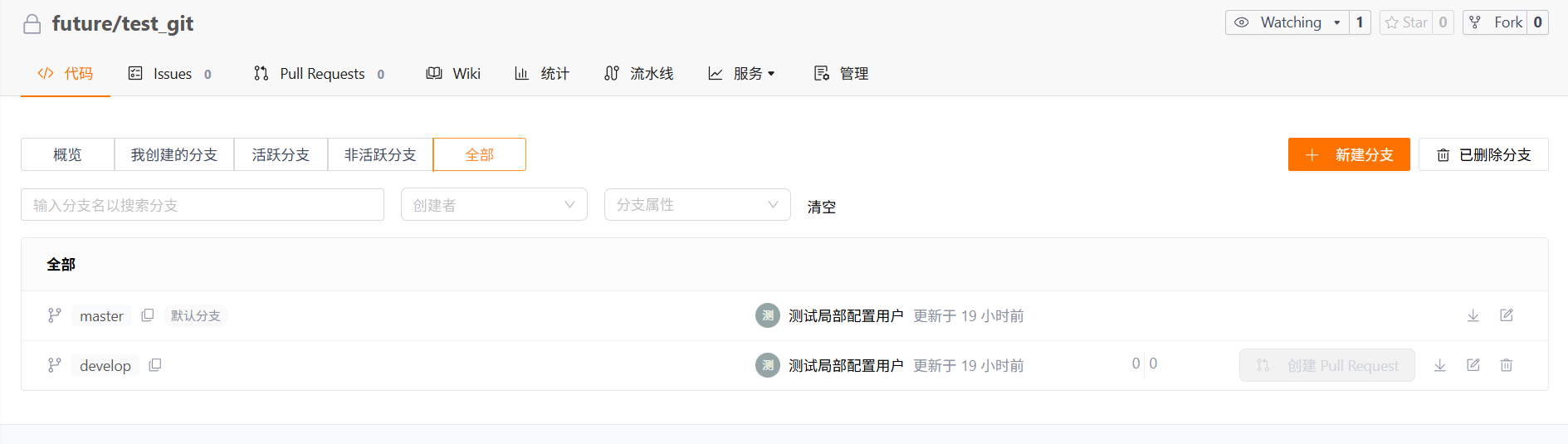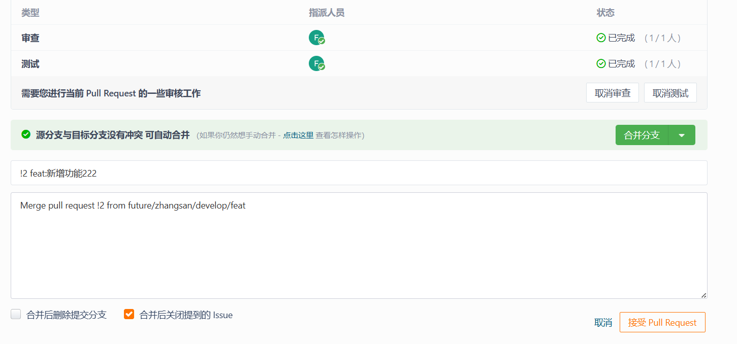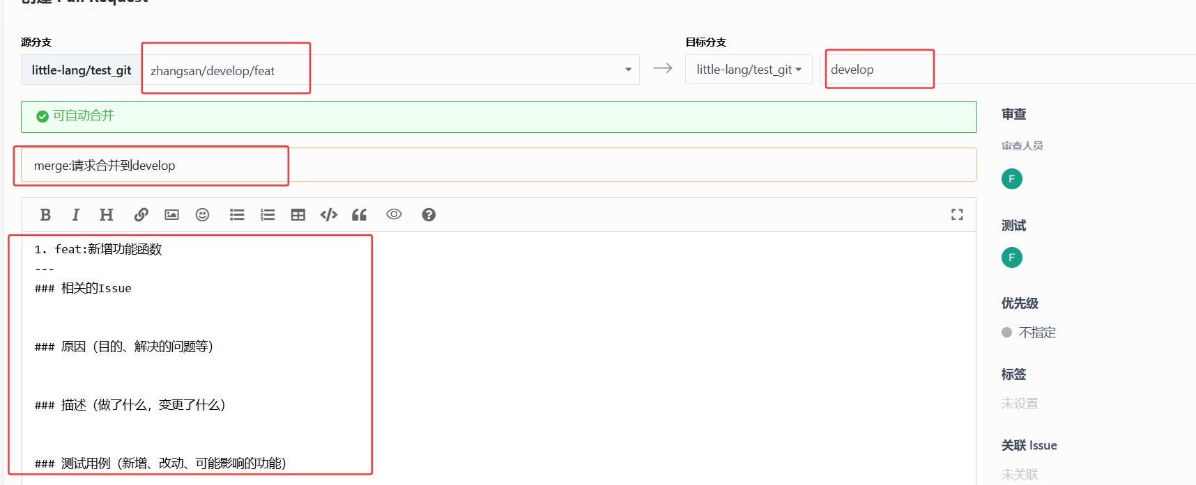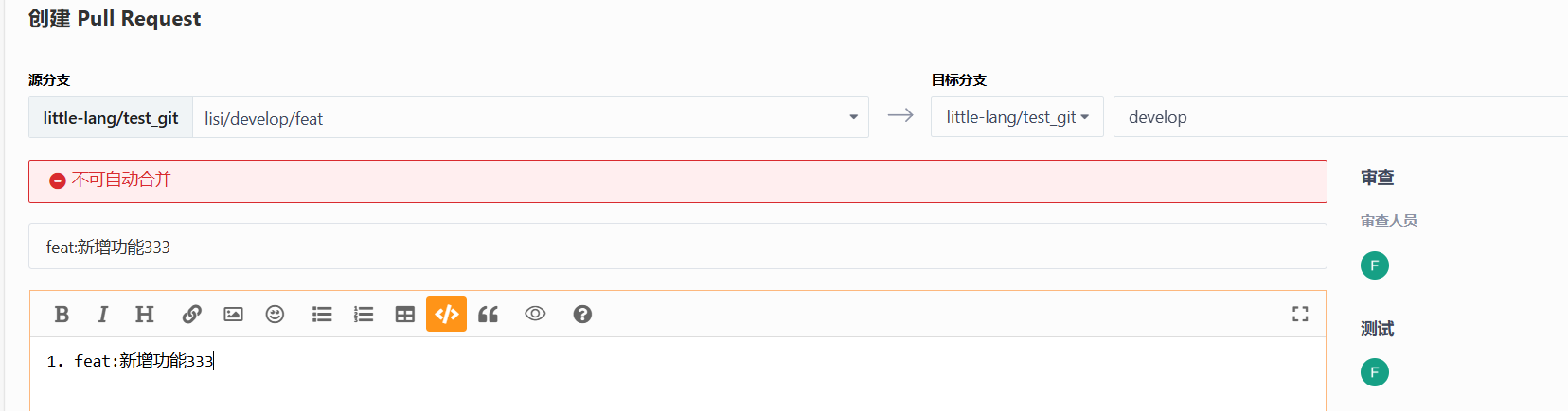 然后张三测试并验证了自己功能没有问题,部门的测试也验证了这里的功能没有问题后,张三开始提PR(pull request),请求合并分支到develop分支上: