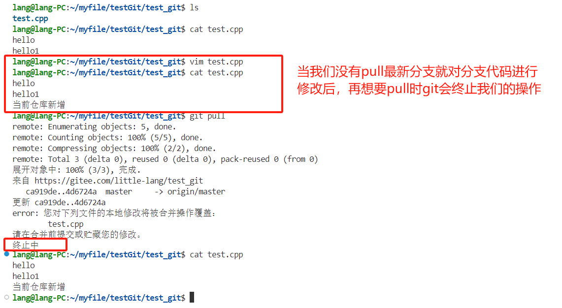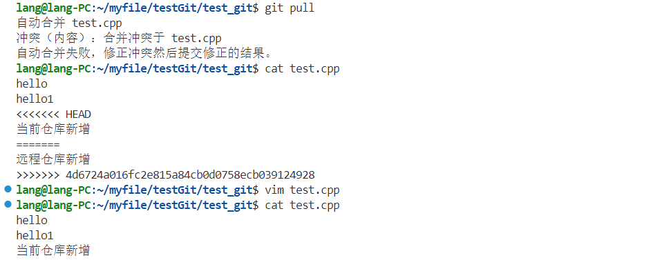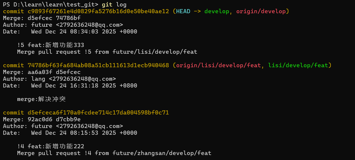 于是李四这边切换到develop分支使用git pull拉取了一下,发现这边确实他的分支不是最新了的,然后他这边再切换回他自己的分支进行一次merge操作,将develop分支合并到自己的分支看看有哪些冲突: