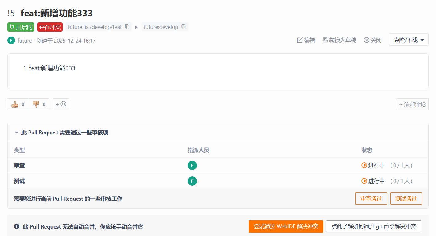 李四提交完PR后,这个提交到了mentor这边,然后这边mentor看到了这里PR,发现了冲突;