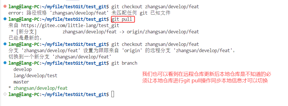 成员拉取到仓库后需要切换到远程的某个分支上: