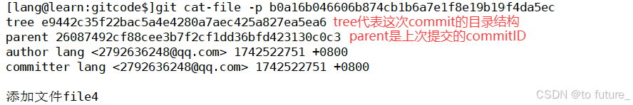blob)和子目录(tree)的引用,并且它们的哈希值会记录在树对象中。tree对象本质上是一个目录的快照。- commit :表示一次提交,包含了提交信息(如作者、日期和提交信息)、父提交以及一个指向