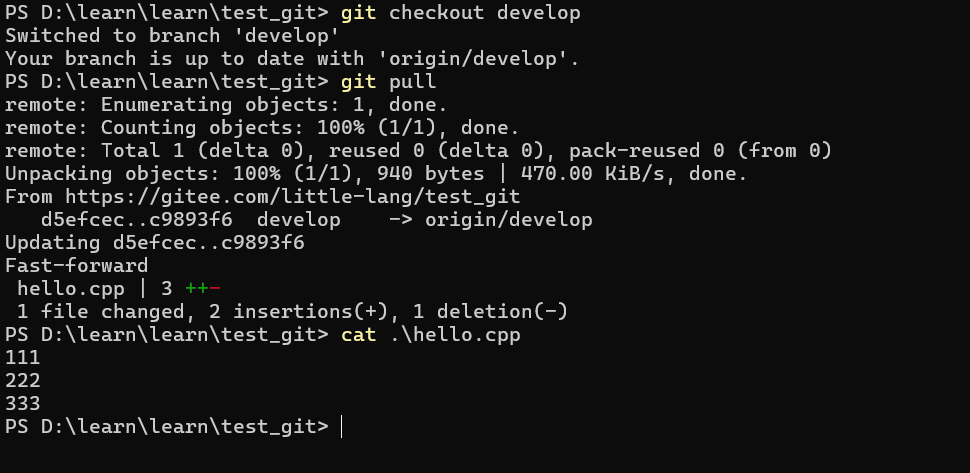 此时再切换到develop分支就可以看到新增了功能222和功能333的全部代码了: