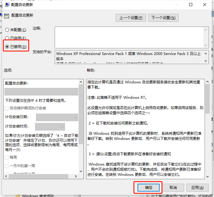 ++step03.++ 在弹出的**"配置自动更新"** 窗口中,选择**"已禁用"** ,再单击**"确定"**。