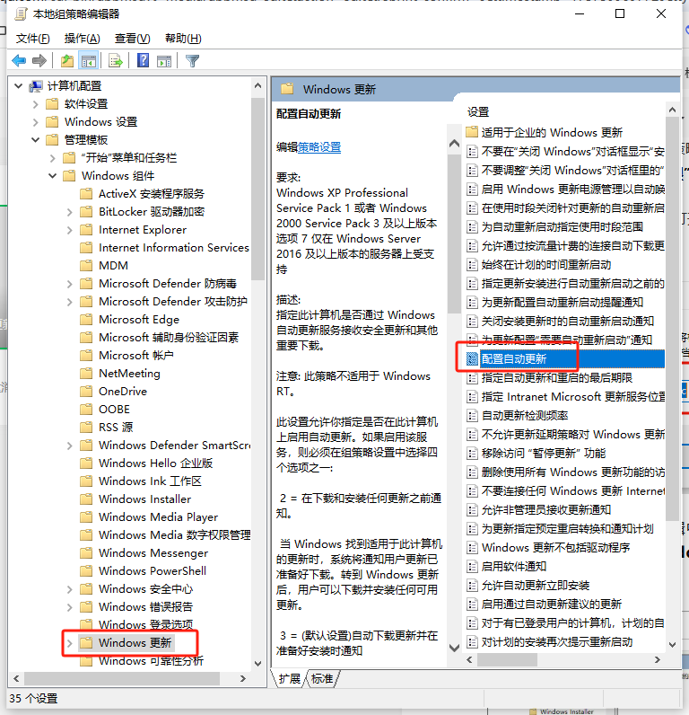 ++step02.++ 在弹出的本地组策略编辑中,依次单击**"计算机配置" > "管理模板" > "Windows组件" > "Windows更新"** ,然后找到**"配置自动更新"**并双击打开它。