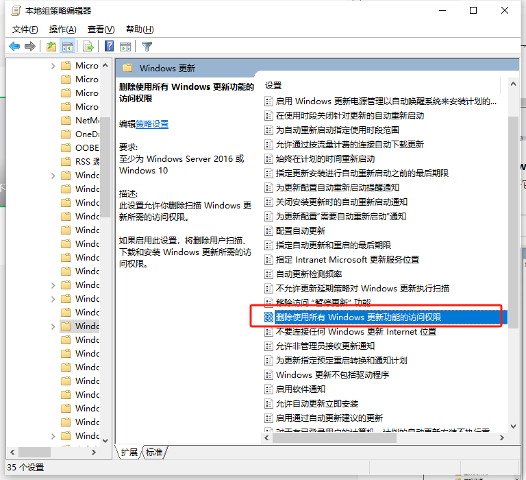 ++step04.++ 然后在**"Windows更新"** 页面找到**"删除使用所有Windows更新功能的访问权限"**,并双击打开它。