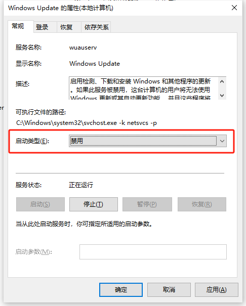 **++step03.++在弹出的"Windows Update的属性"对话框中,将"启动类型"设置为"禁用"。