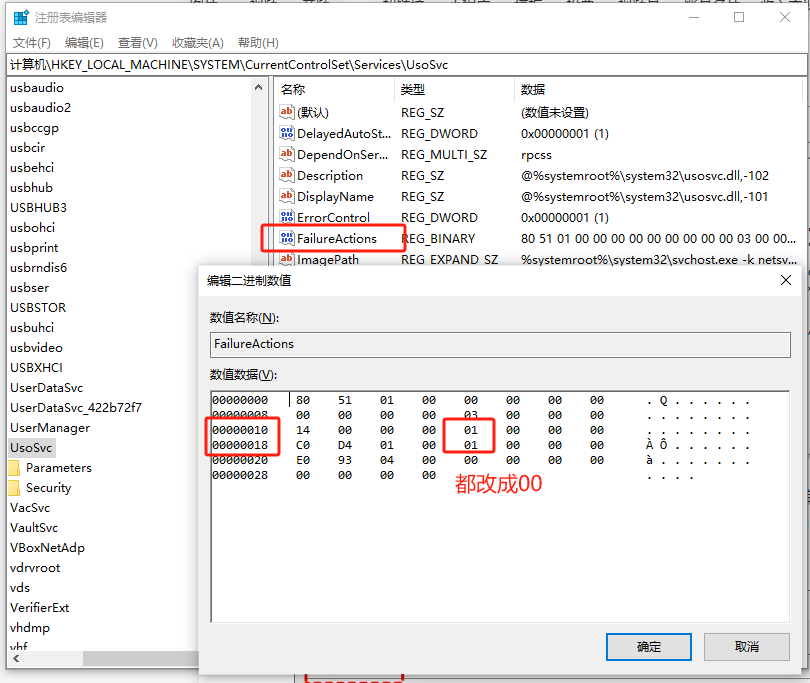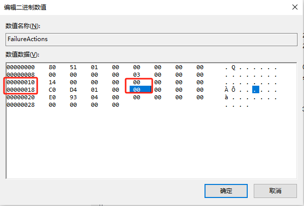 ++step04.++ 然后再找到**"FailureActions"** 键并双击进行编辑,将**"00000010"** 和**"00000018"** 行中的第五个数值,由原来的**"01"** 改为**"00"** ,再单击**"确定"**。