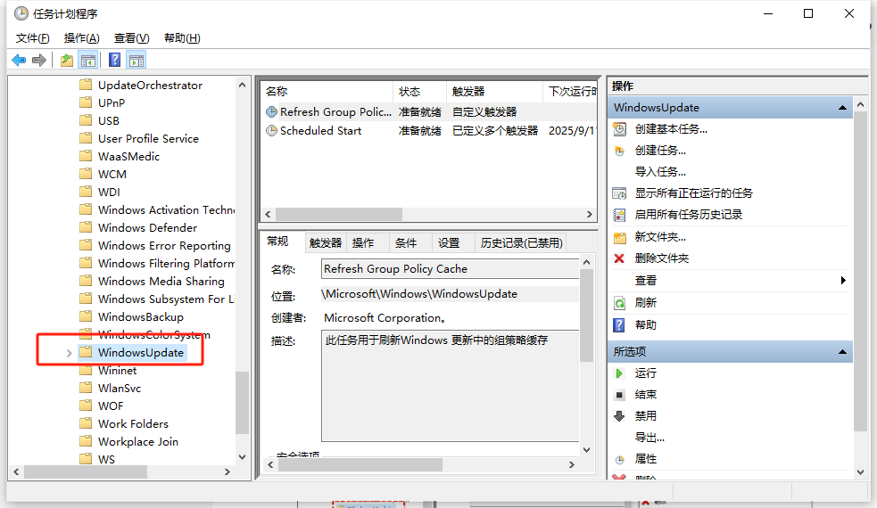 ++step02.++ 在任务计划程序窗口中,跳转到该路径**"任务计划程序库/Microsoft/Windows/WindowsUpdate"**。