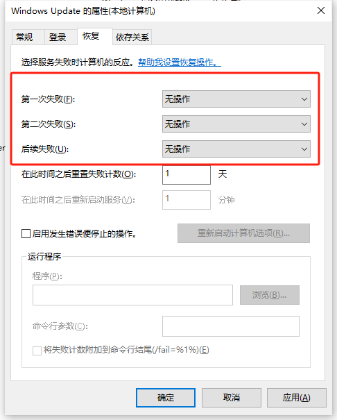 ++step04.++然后再单击"恢复" ,将图中框选的部分都设置为"无操作"** ,再单击**"应用"** 和**"确定"**。