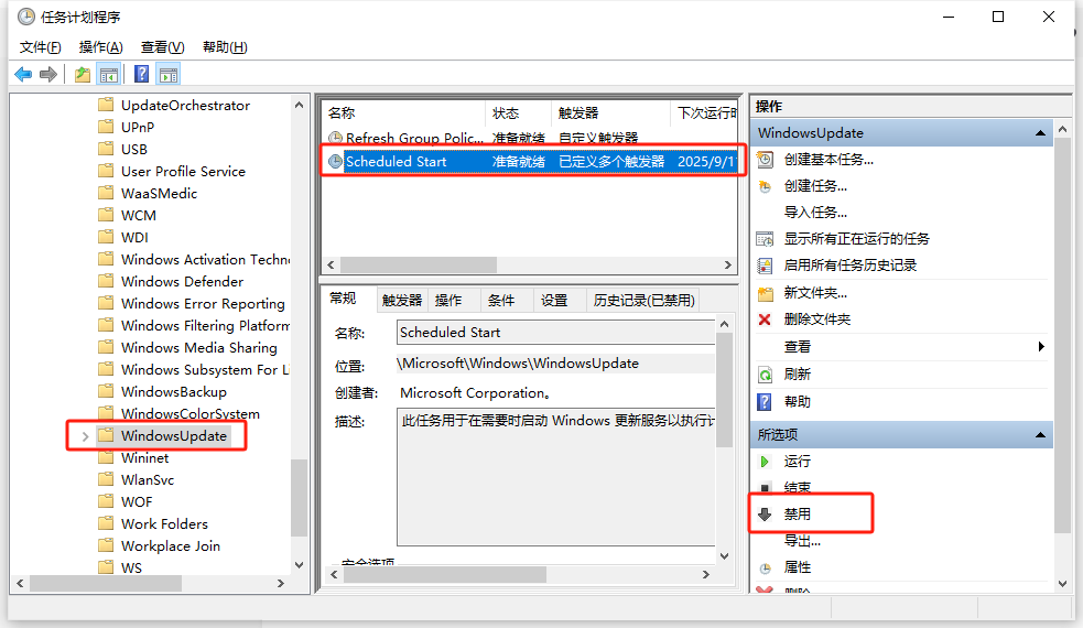 第3种方式也可以通过任务计划程序,将**"Schedule Start"**禁用,以实现Win10、win11自动更新的关闭。