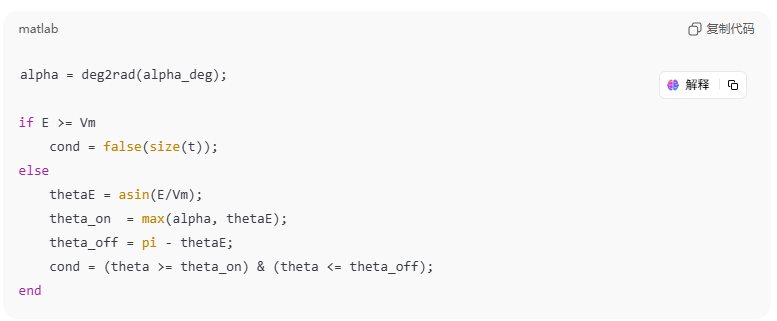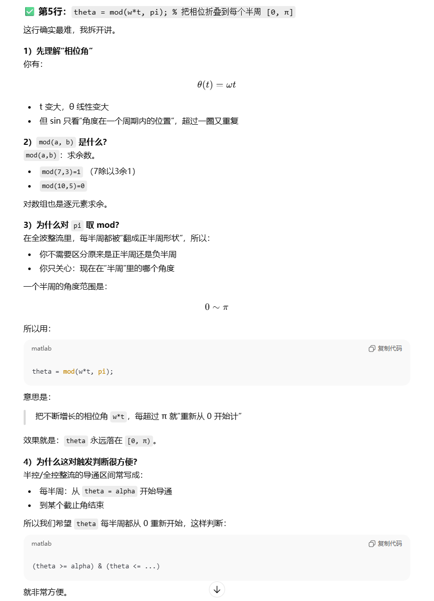 mod(..., pi)后,相位就永远落在[0, π)这样每个半周都能用同一套判断条件(导通从 θ_on 到 θ_off)。
