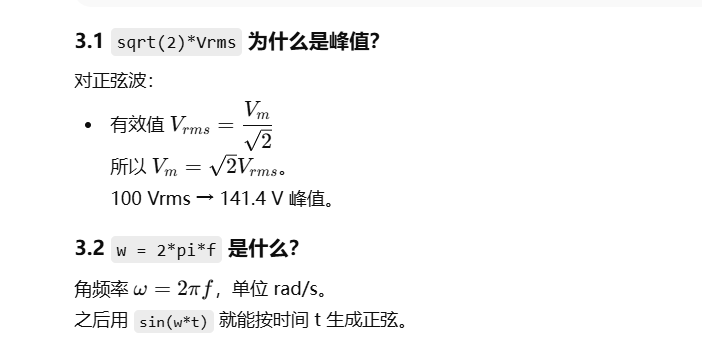 Vm = sqrt(2)*Vrms; % 正弦峰值 (100Vrms -> 141.4Vpeak)