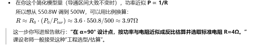 该方法可仿真得到电压/电流波形及功率随α变化规律,满足课程设计展示与答辩要求。