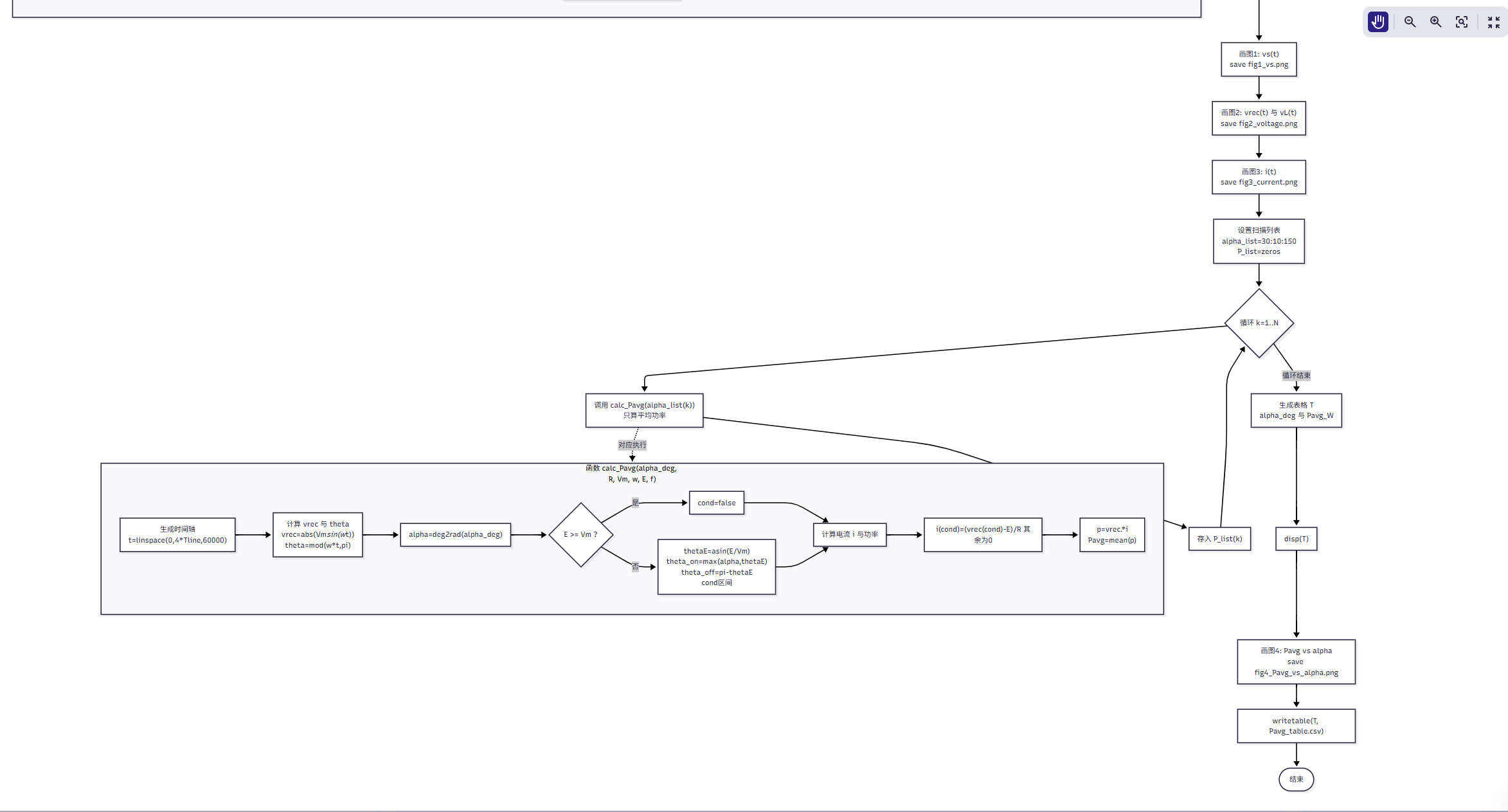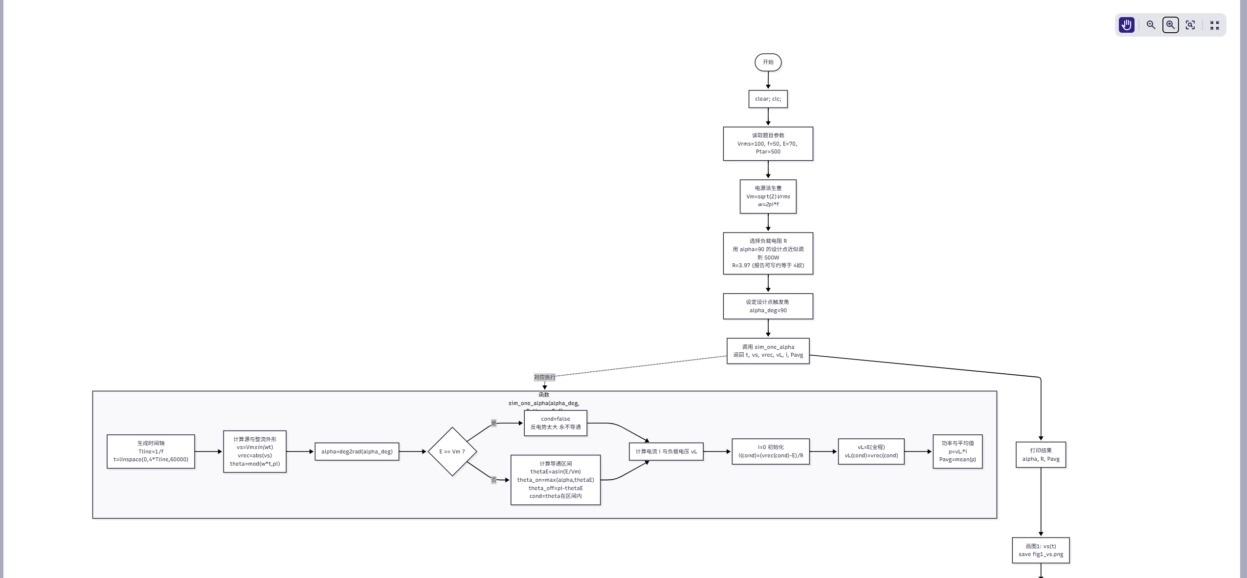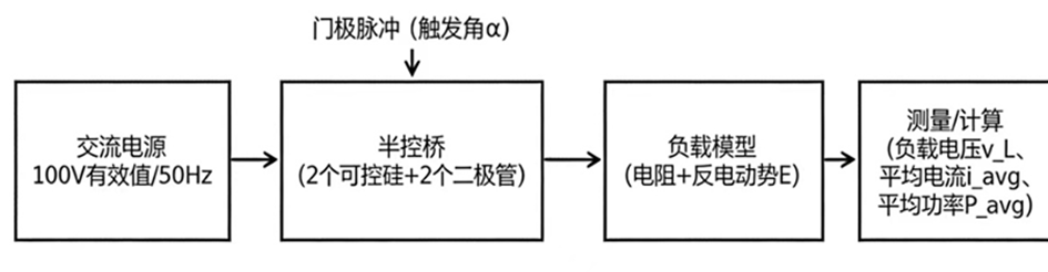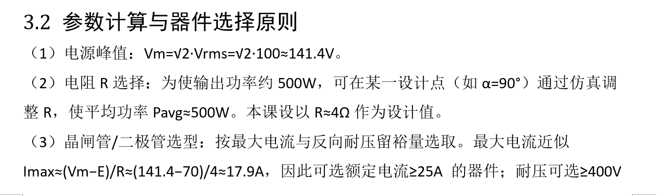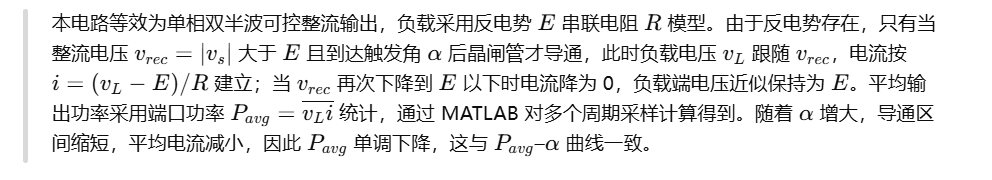 完成主电路与控制思路说明、参数选取与计算、MATLAB 仿真建模;输出关键节点波形(vs、vL、i等)、以及 Pavg-α 关系曲线;总结仿真中遇到的问题与解决方法。