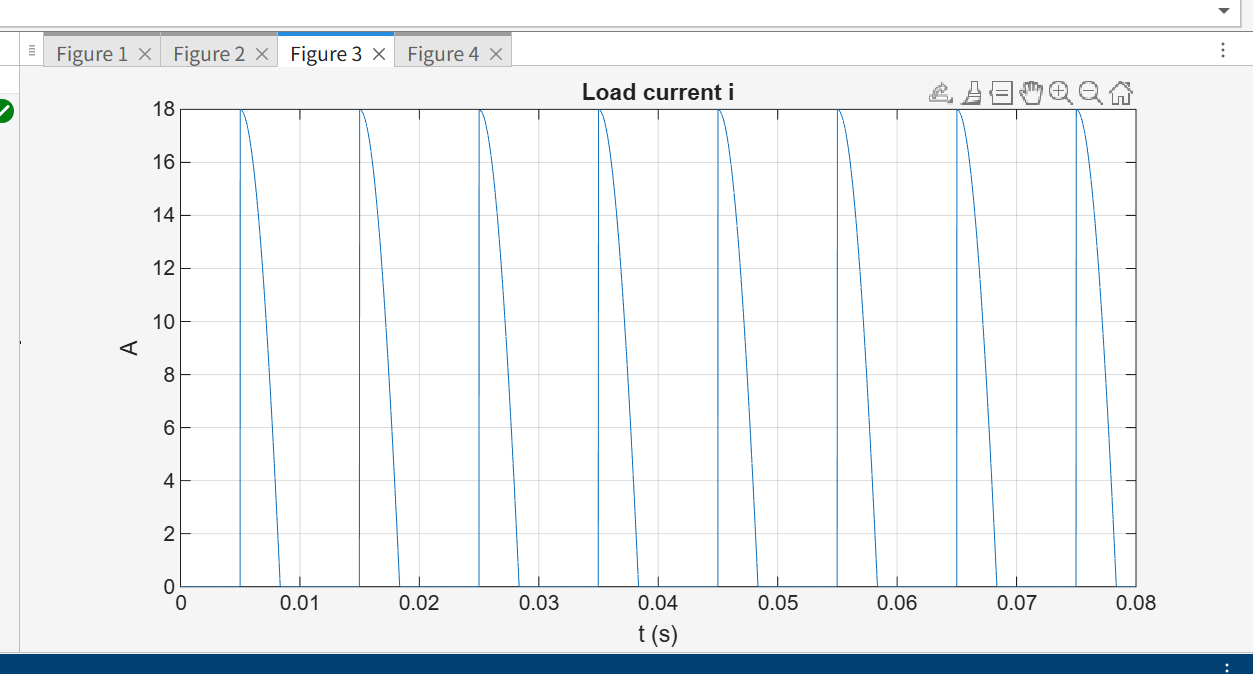 title('Load current i'); xlabel('t (s)'); ylabel('A');