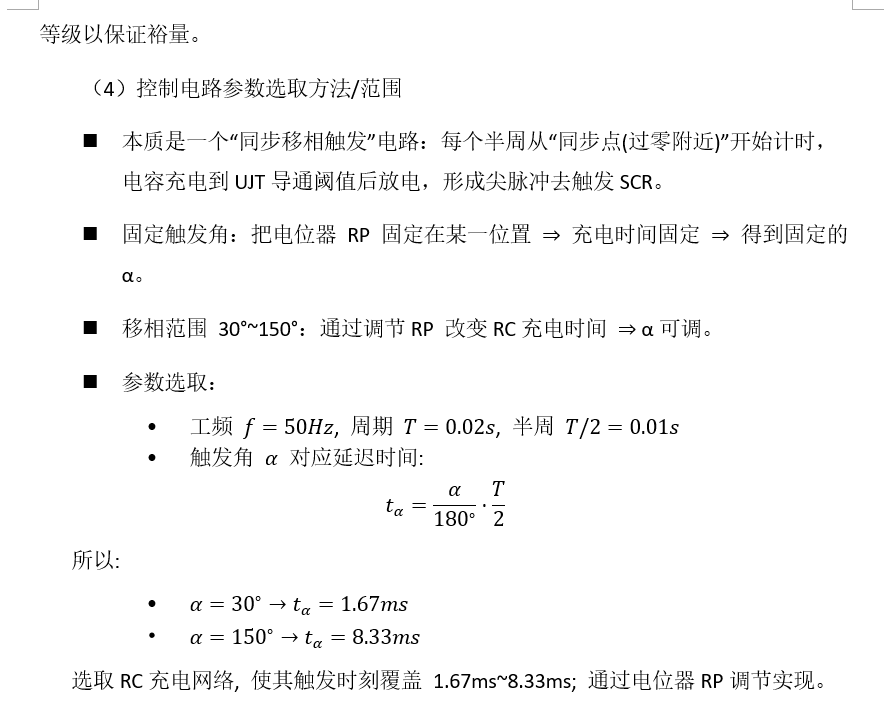 控制电路的核心任务是在每个半周的相位角α时刻向对应晶闸管施加门极触发脉冲。实际硬件可采用同步移相触发电路(如锯齿波比较式、UJT同步触发等).