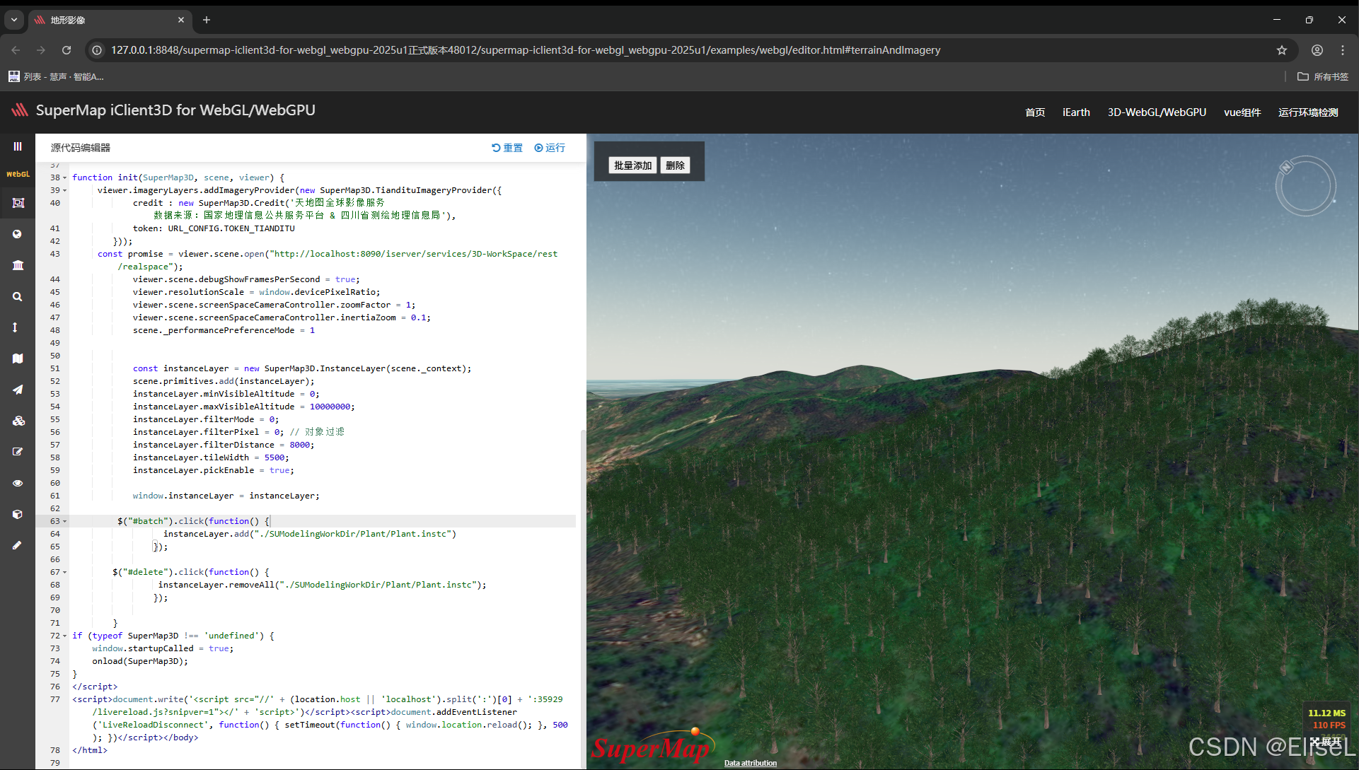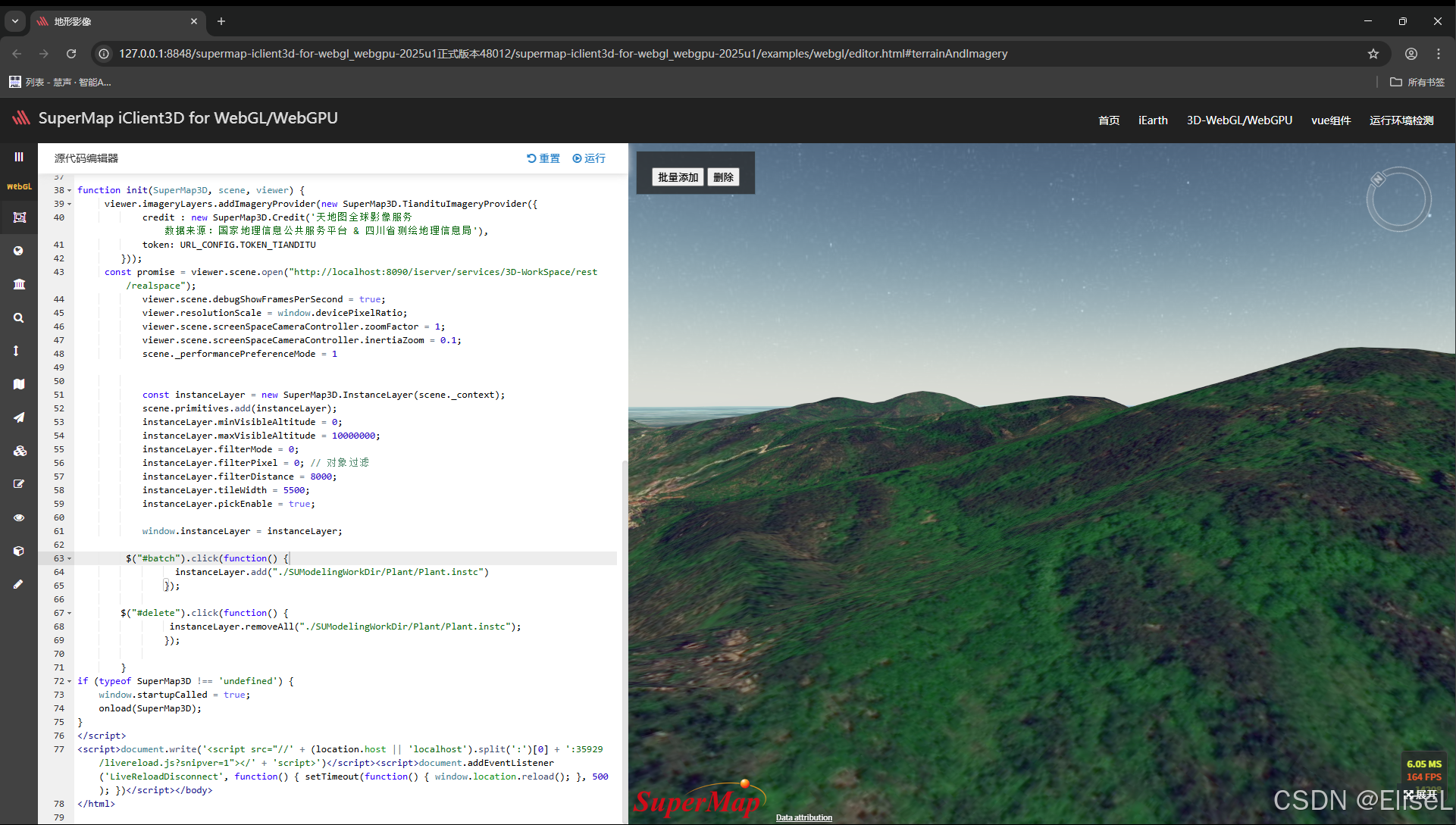 本文主要介绍使用SuperMap iClient3D for WebGL加载SuperMap iDesktopX 场景中,场景美化功能结果。iDesktopX进行资产编辑,绘制区域。设置工程路径,保存美化结果,可以获得.instc以及.s3mb格式的实例化模型。在SuperMap iClient3D for WebGL中,通过接口instanceLayer.add/removeAll即可实现添加或删除实例图层 。