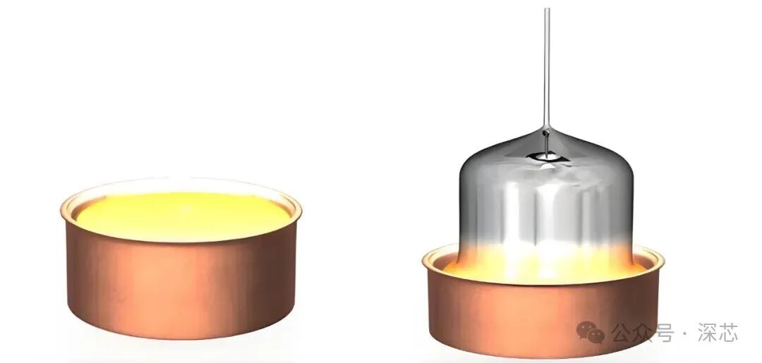 接下来,将种子晶体缓慢旋转并向上拉。硅熔体在向上拉动时凝固成固体硅柱,离开液面的硅原子有序排列,形成单晶硅柱。