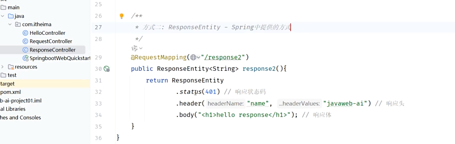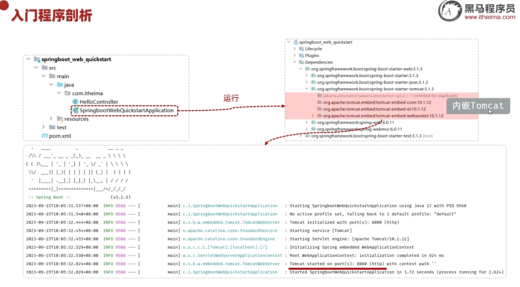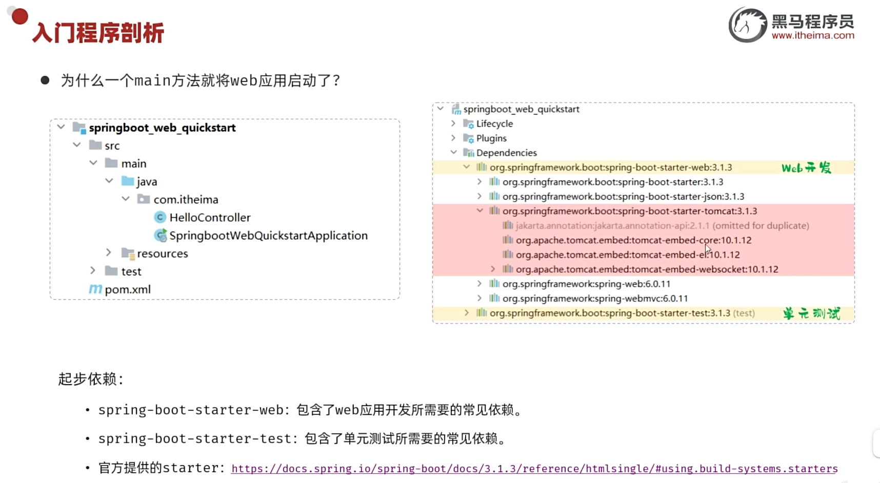起步依赖,会将tomcat服务器内嵌进来,这个main方法运行后,将启动内嵌进来的TomCat服务器,会将我们所编写的项目代码部署在这个tomcat服务器当中,之后就可以用浏览器来访问所制作的页面。