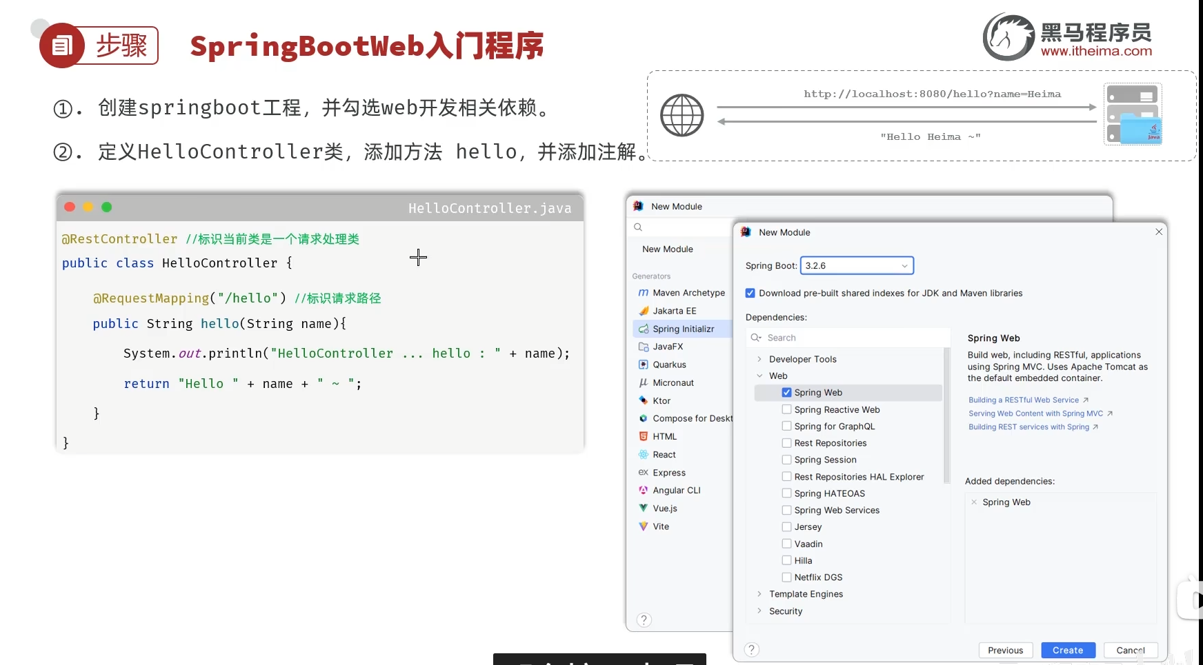 类的注解(处理请求)和方法的注解(请求路径)一定要写,方法的注解requestmapping(" "),括号里面写网址信息,代表:这个方法要处理哪一个网址的请求。。