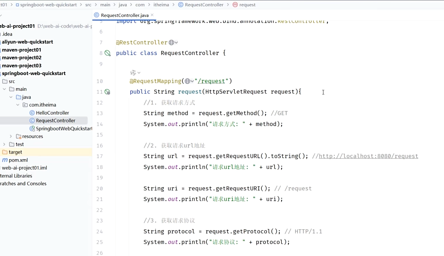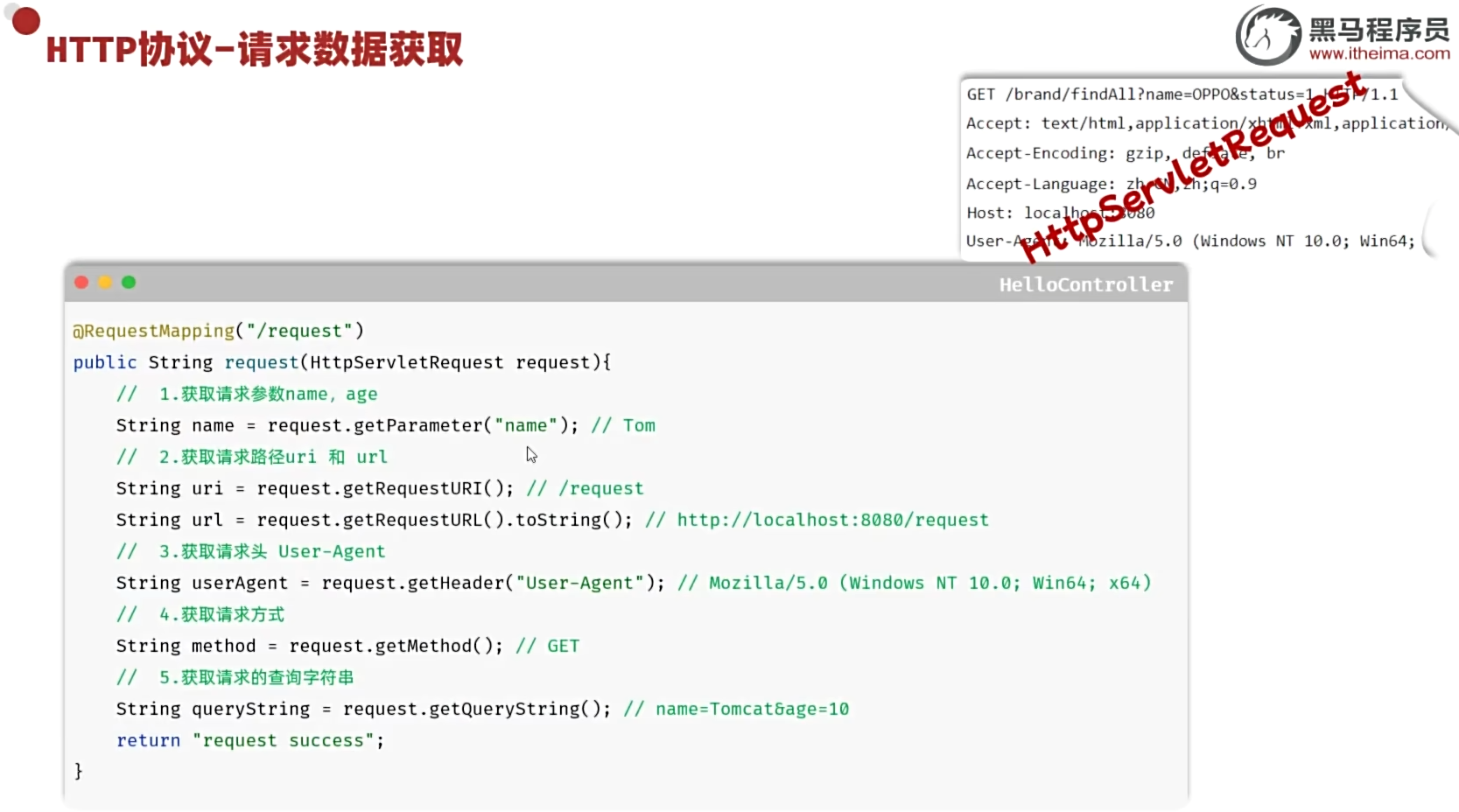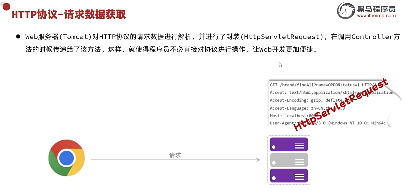 把浏览器发送来的请求数据都封装在了HttpServletRequest这个类的某个对象中,并把这个对象传递给了请求处理类中的方法,供这些方法调用。