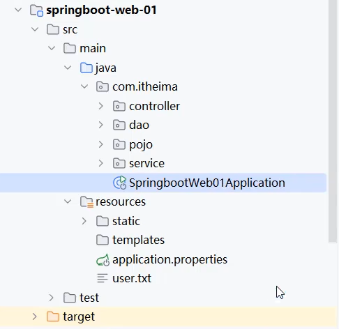 - **static包里面是静态资源,是HTML、CSS、JS等。**templates是模板。下面的application.properties是配置文件。