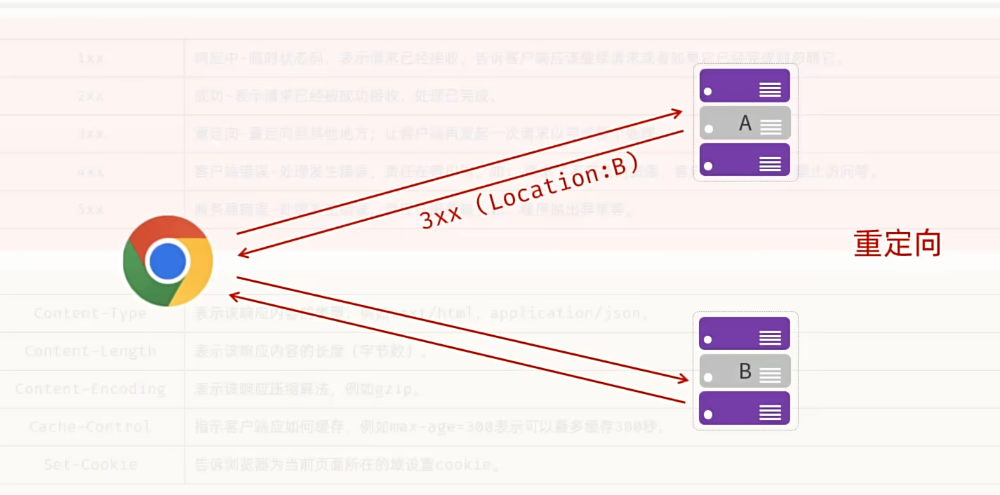 一开始浏览器向A 请求资源,但是资源不在A服务器,所以A响应 "3XX"状态码来重定向,浏览器就去B服务器去找资源,最后得到资源。