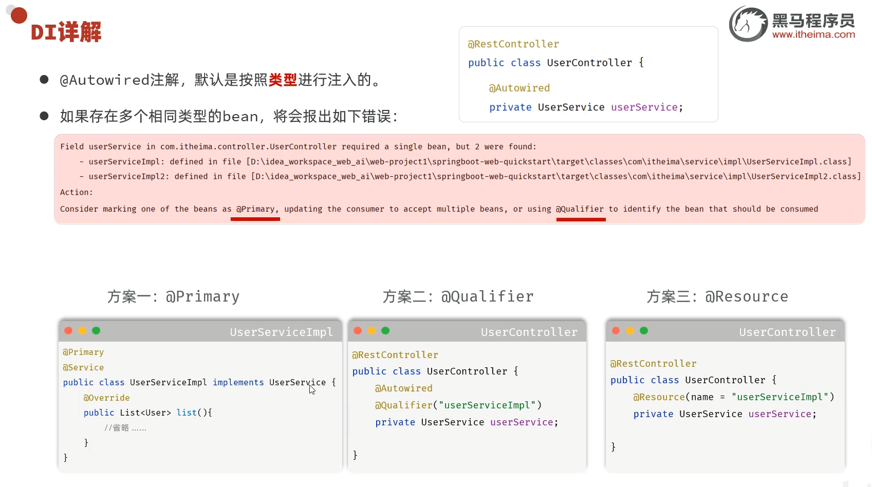 当存在多个相同接口类型的实现类时,此时IOC容器有多个相同类型的对象,直接运行会报错。