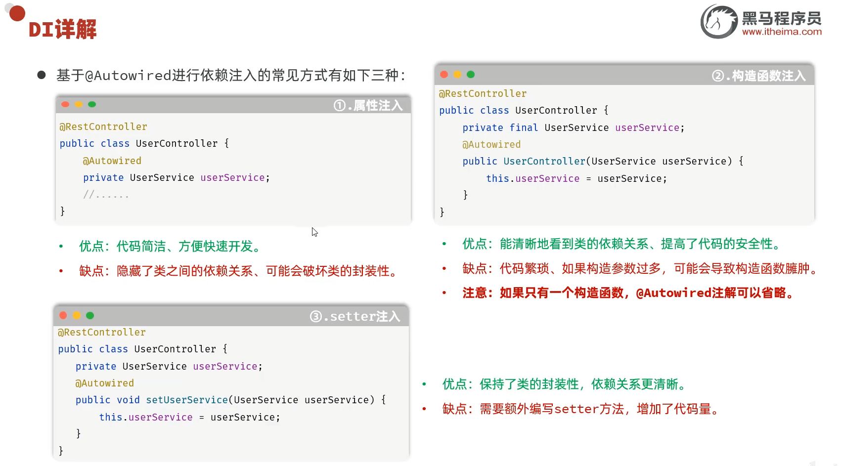 常用的是 属性注入 和 构造函数注入。90%的项目用属性注入,因为代码简单;构造函数注入更加规范。setter注入很少用。